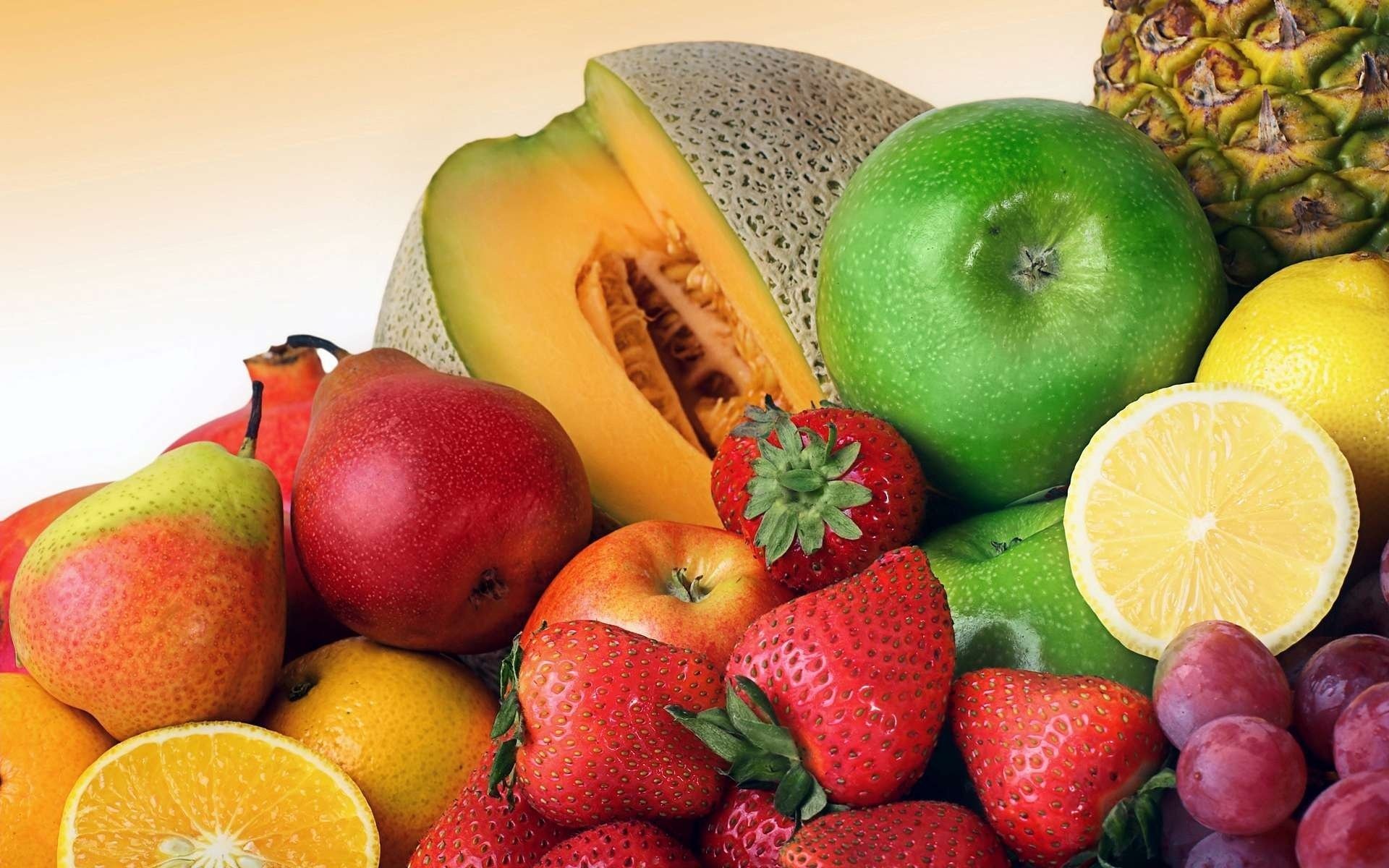 Obstsortiment: Erdbeeren, Zitrone, Trauben, Birnen, Orangen, Äpfel, Passionsfrucht