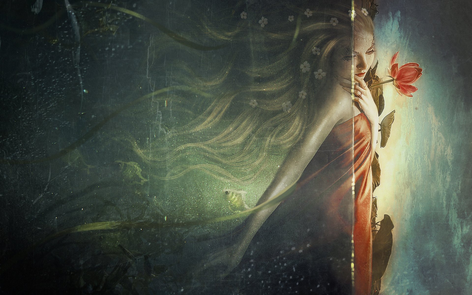 Mädchen Ophelia in Rot mit einer Blume in der Hand