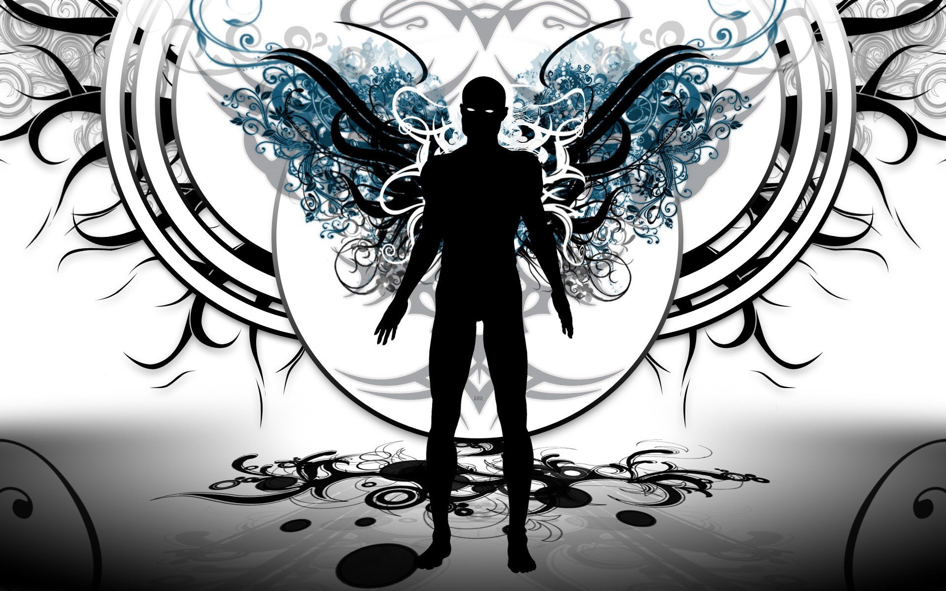 Vor dem Hintergrund der schwarz-weißen Zeichnung zeichnet sich die Stärke des Menschen ab