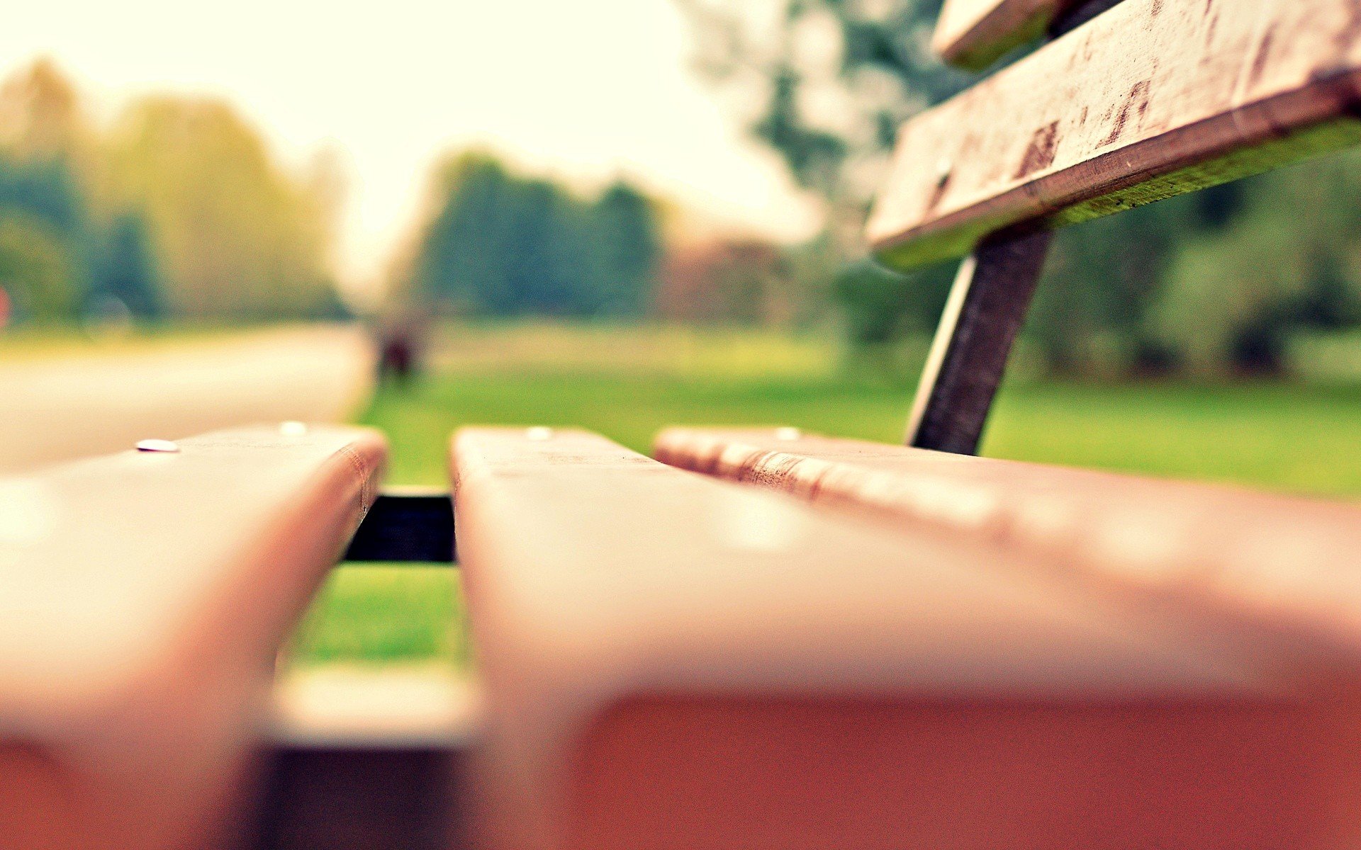Auf der grünen Wiese eine Parkbank an einem Sommertag
