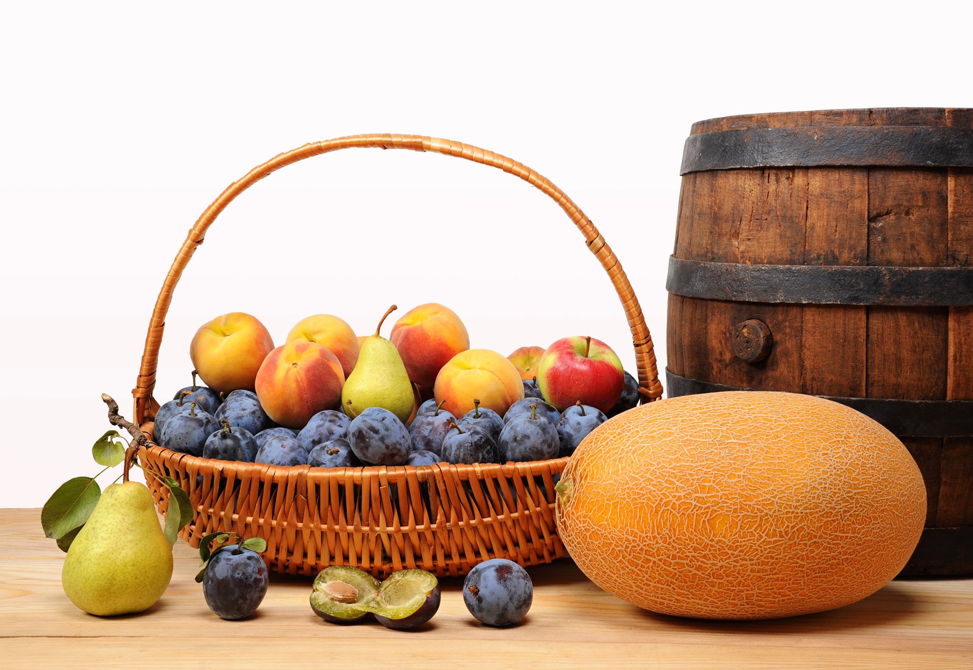 Obst in einem Korb mit einer Melone und einem Fass