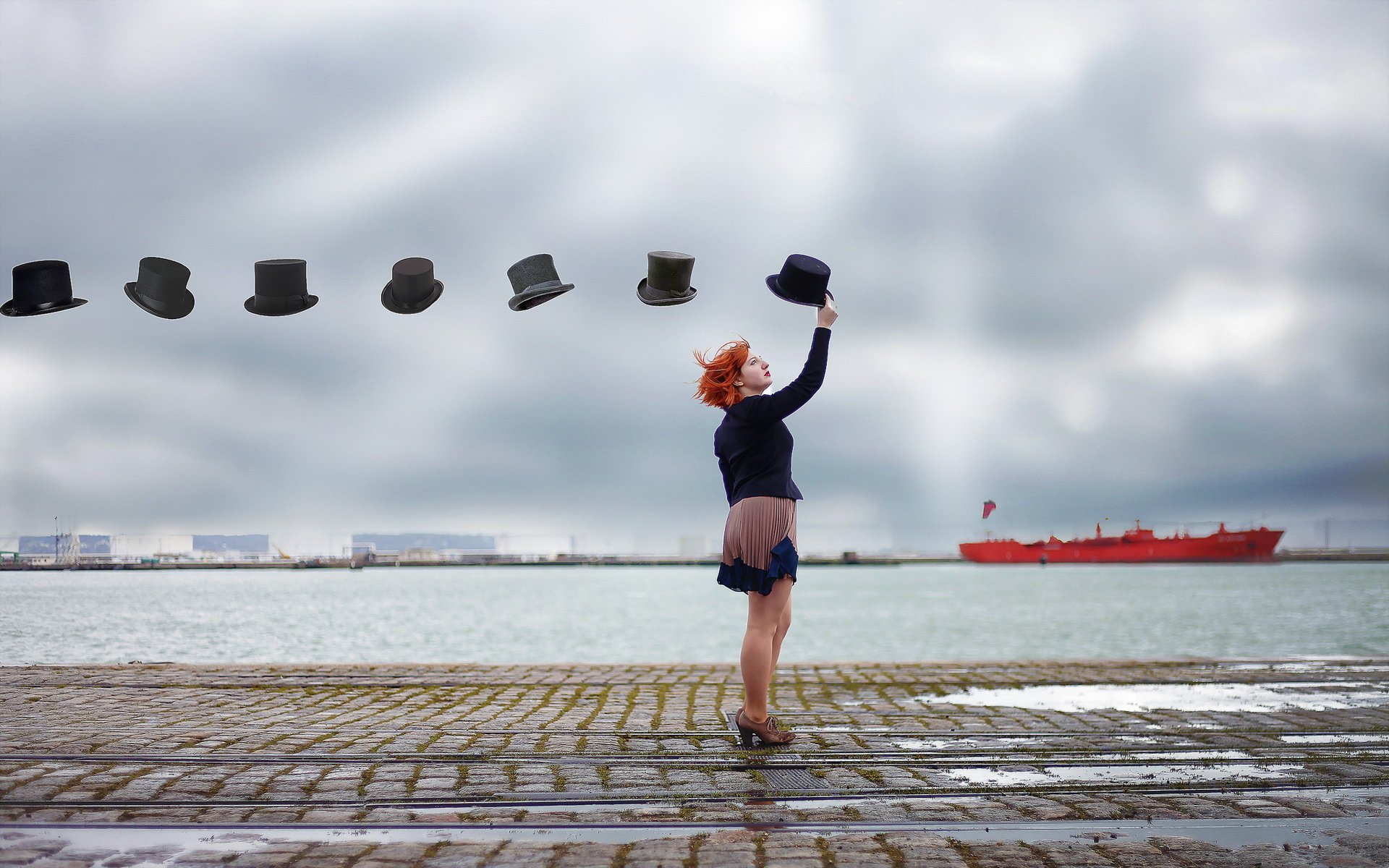 Mädchen mit Hüten am Pier