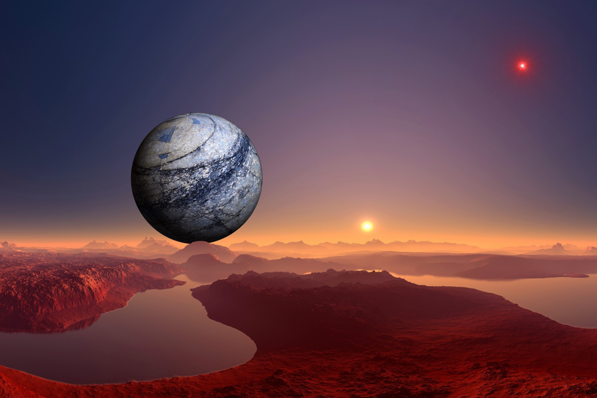 Der Planet und sein Satellit vor dem Hintergrund der fallenden Kometen