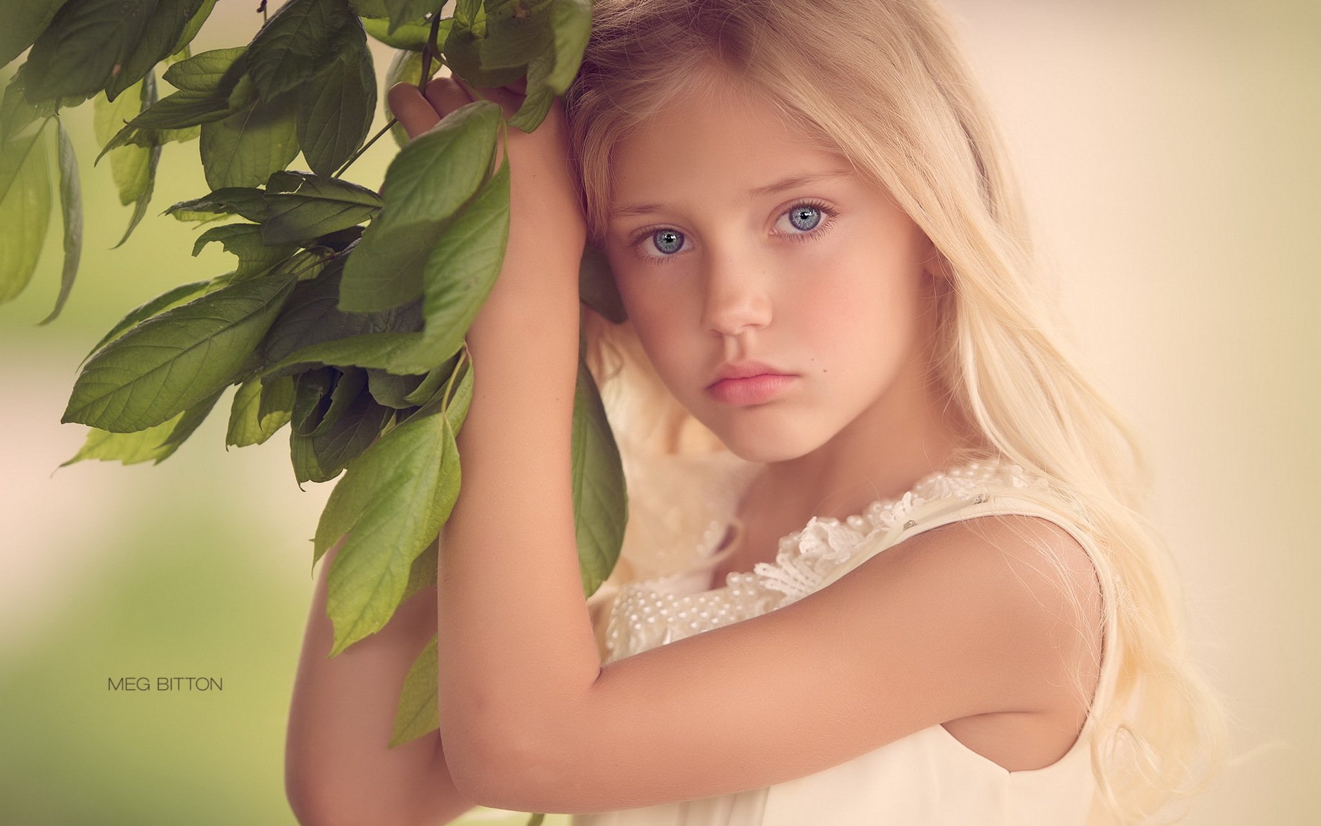 Mädchen hält an einem Ast mit grünen Blättern fest