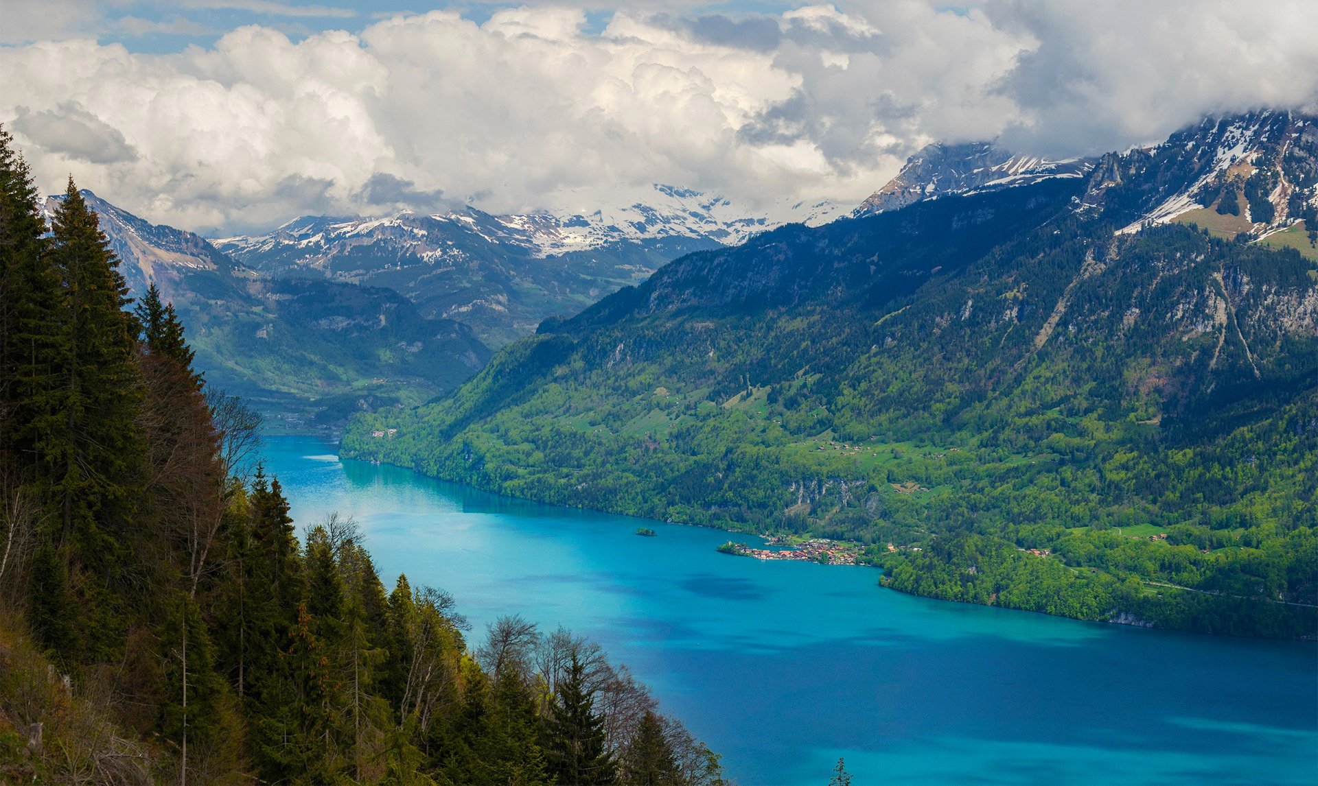 Berge im Schnee, mächtige Fichten