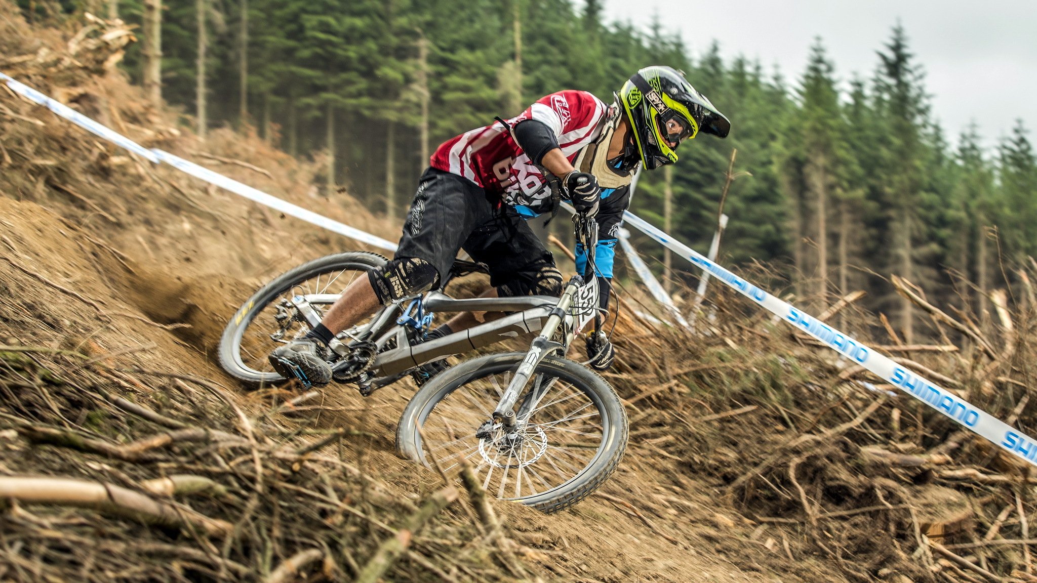 Ein Fahrradfahrer mit Helm nimmt an einem Rennen teil und fährt auf der Straße