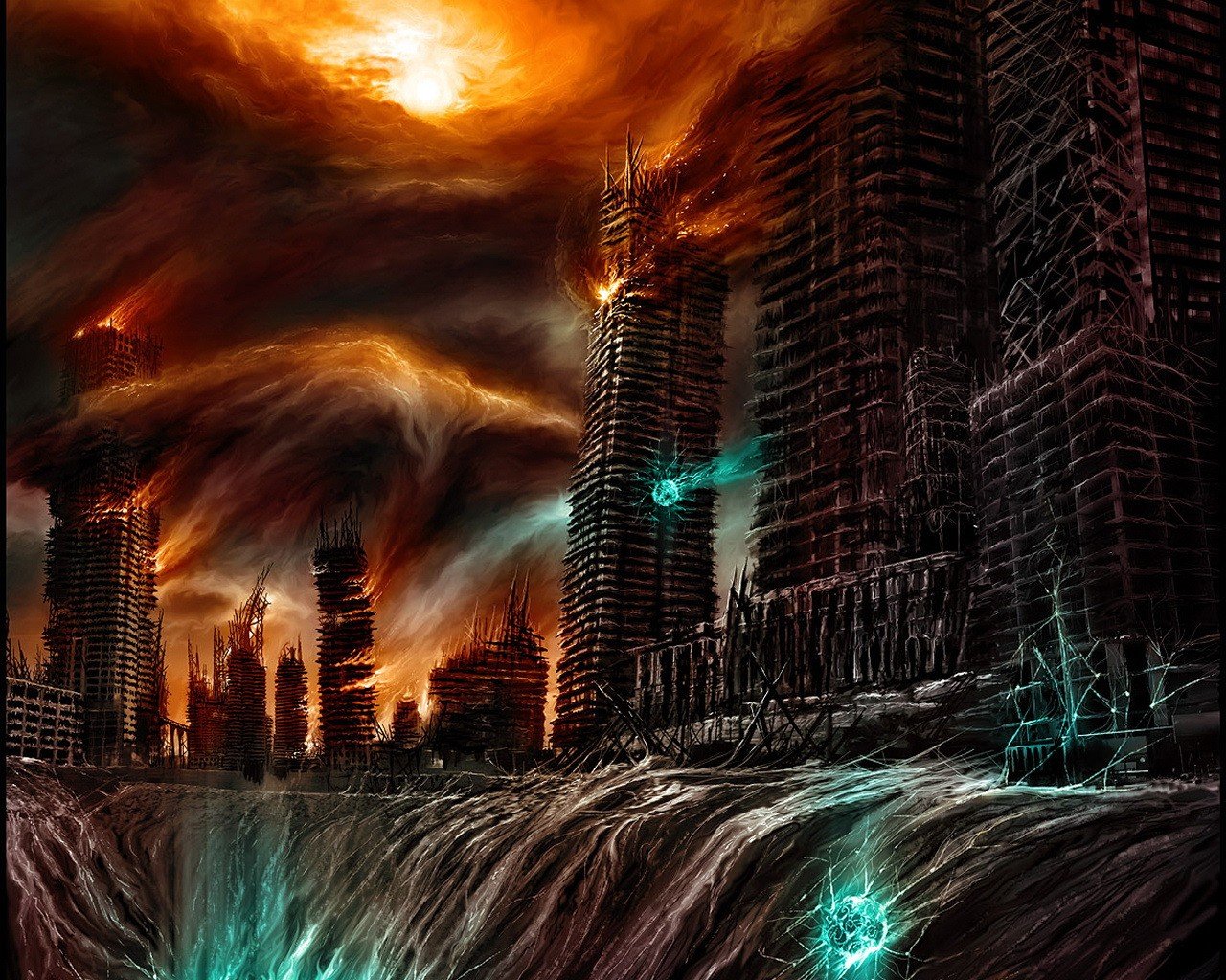 Ein Mann schaut auf die Ruinen einer zerstörten Stadt