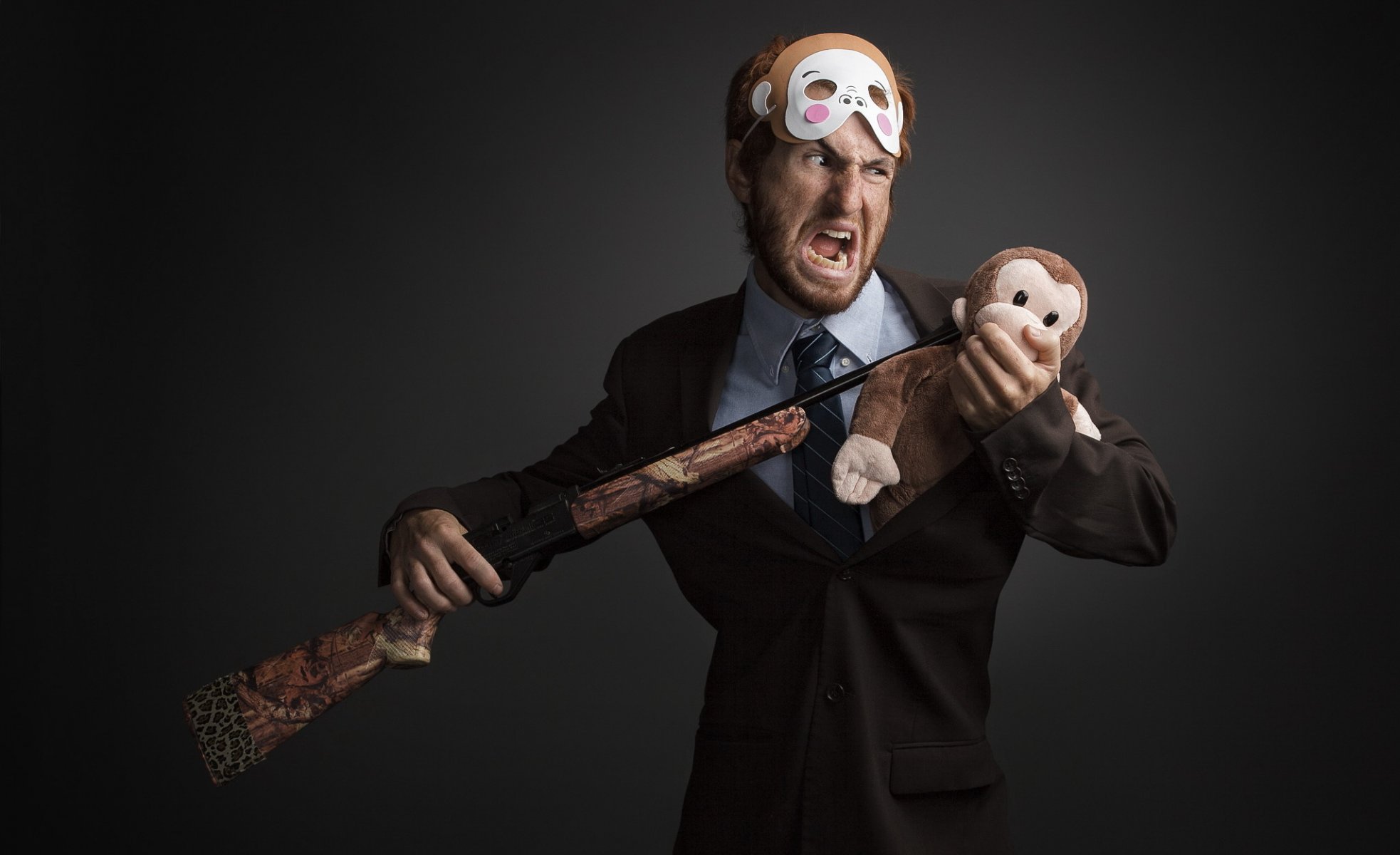 Das Gesicht eines Mannes in einer Maske mit einer Gasmaske
