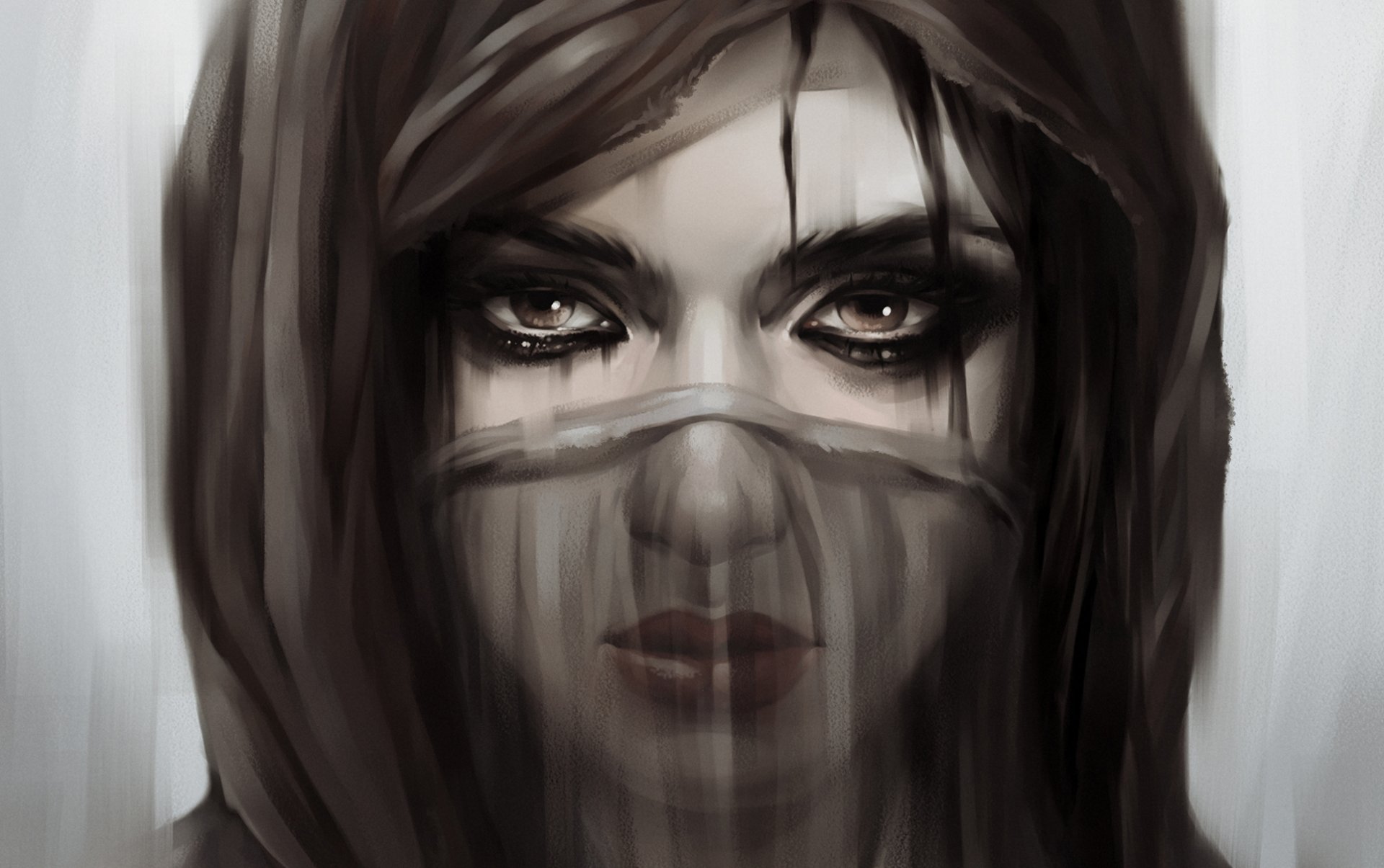 Das Mädchen in einer durchscheinenden Maske schaut genau in die Augen
