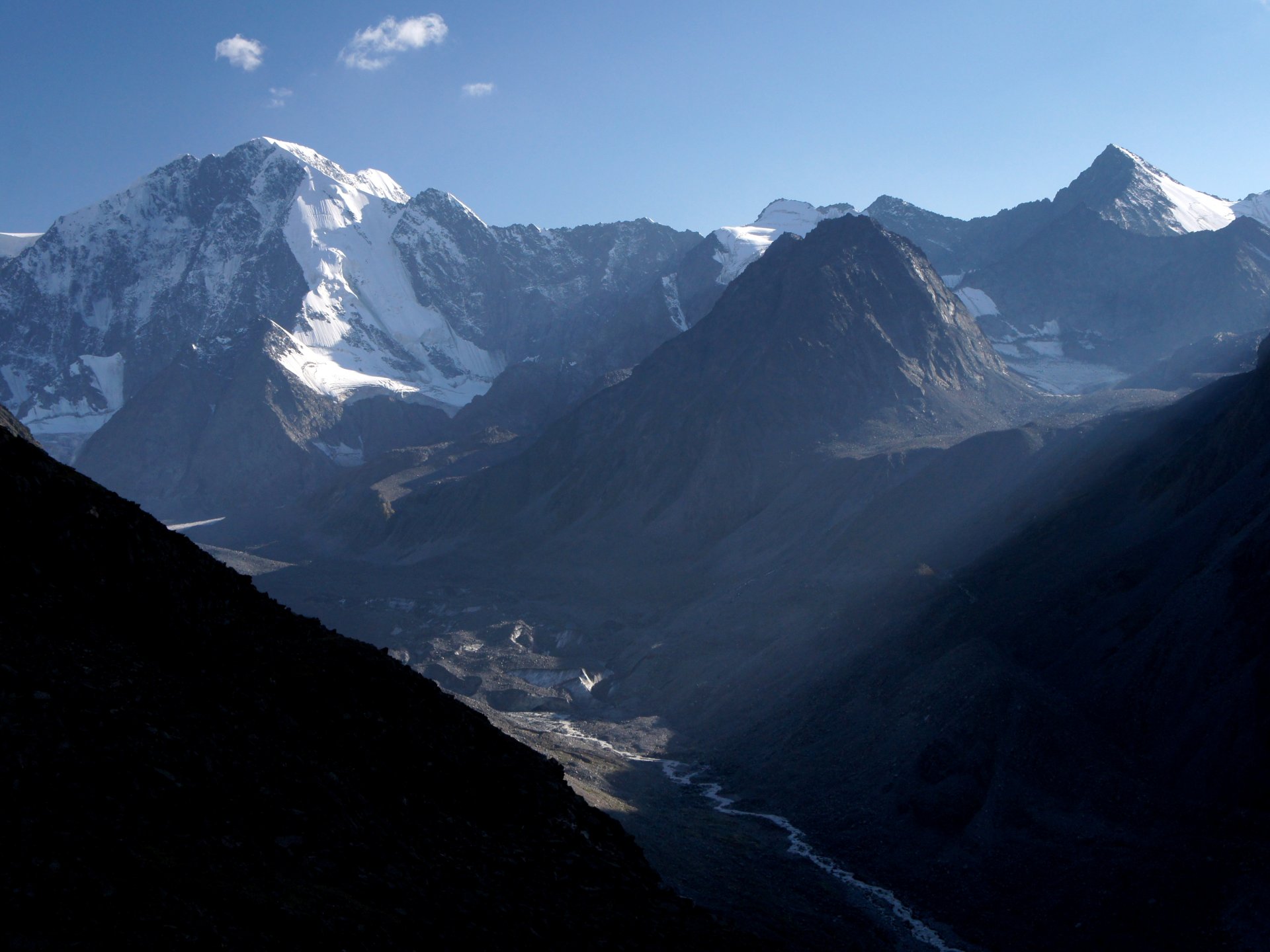 Ein von der Sonne beleuchteter Berg unter den Wolken