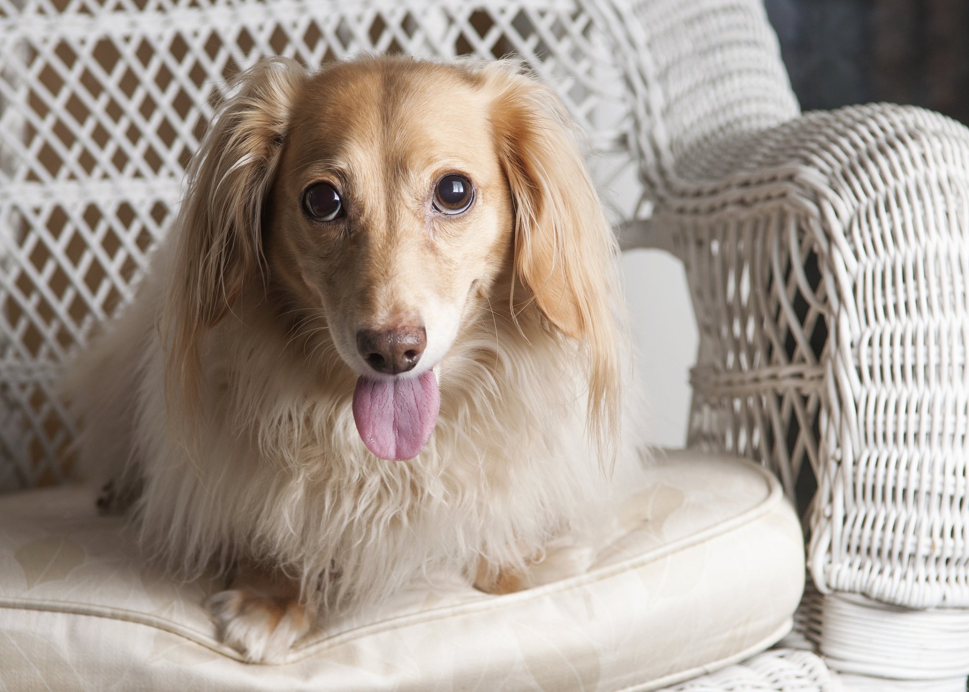 Der Hund läuft durch das Wasser, Wassertropfen fallen von der Schnauze und der Zunge