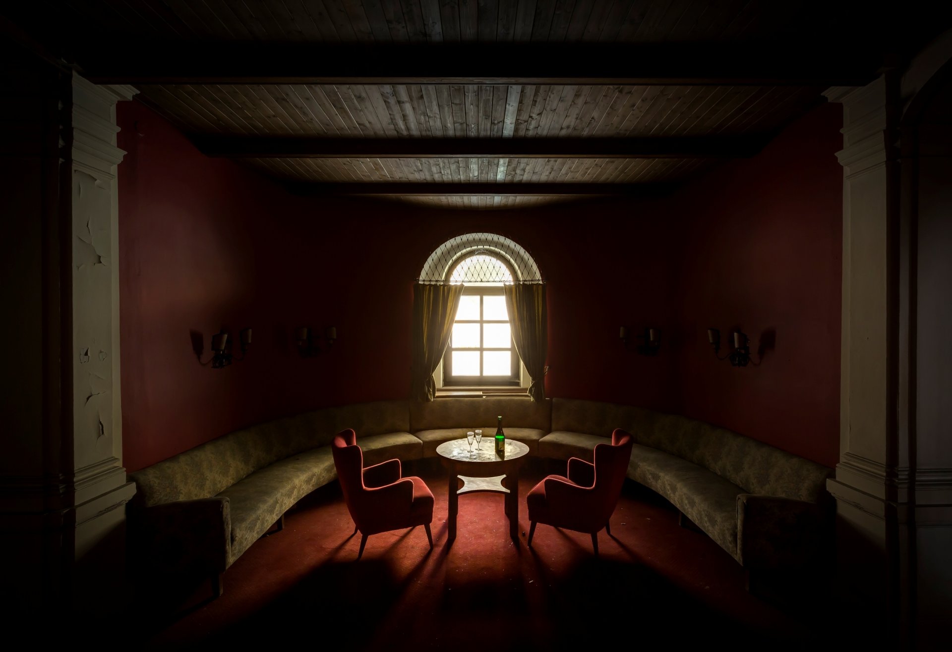 Verlassenes Zimmer mit Sesseln und Fernsehgeräten
