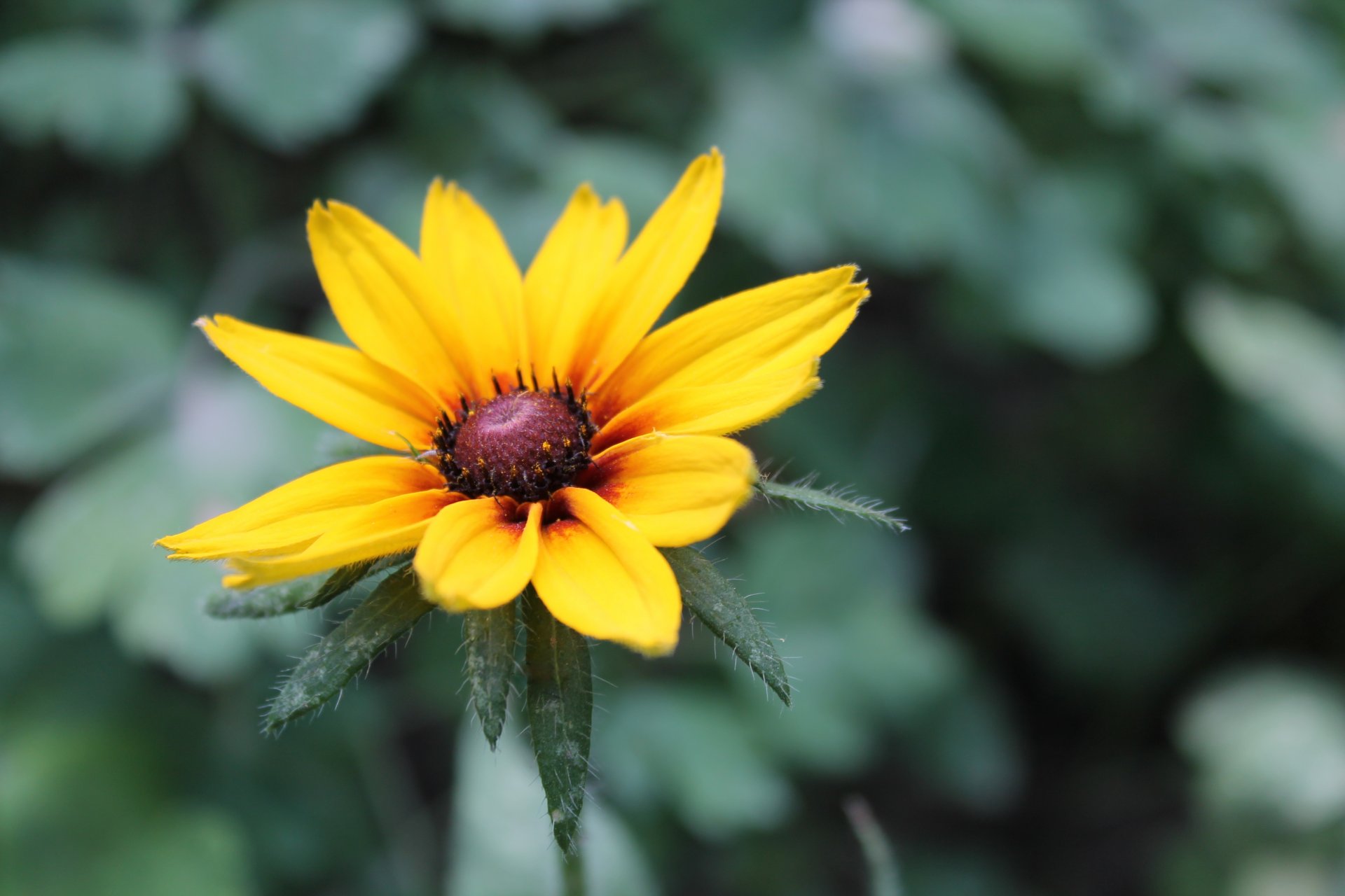 Makrofoto einer Blume mit gelben Blütenblättern auf grünem Hintergrund ein leuchtend roter Apfel mit Kapets