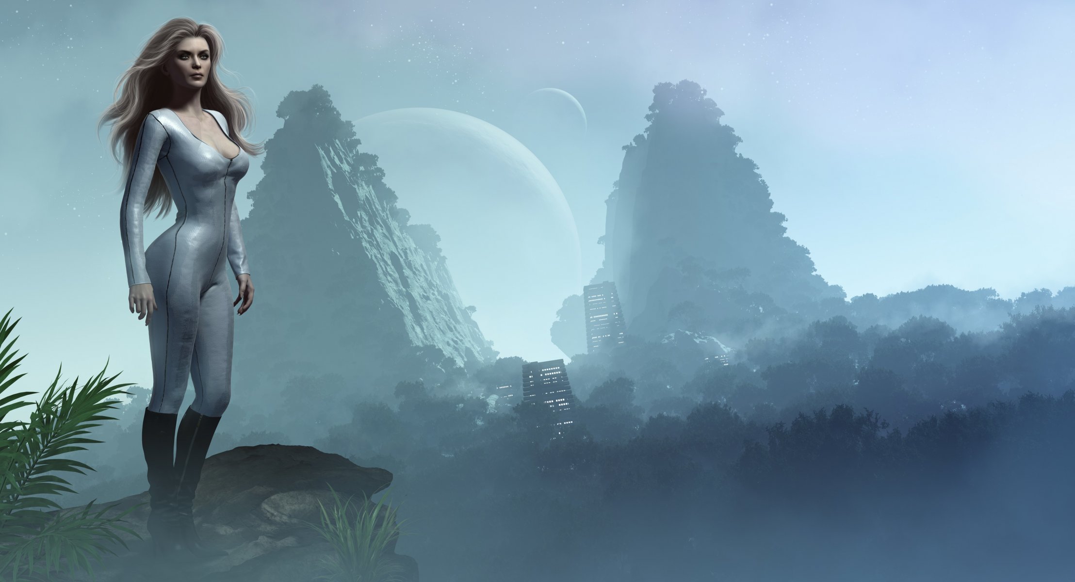 Mädchen im eng anliegenden Overall am Abend am Bergrand