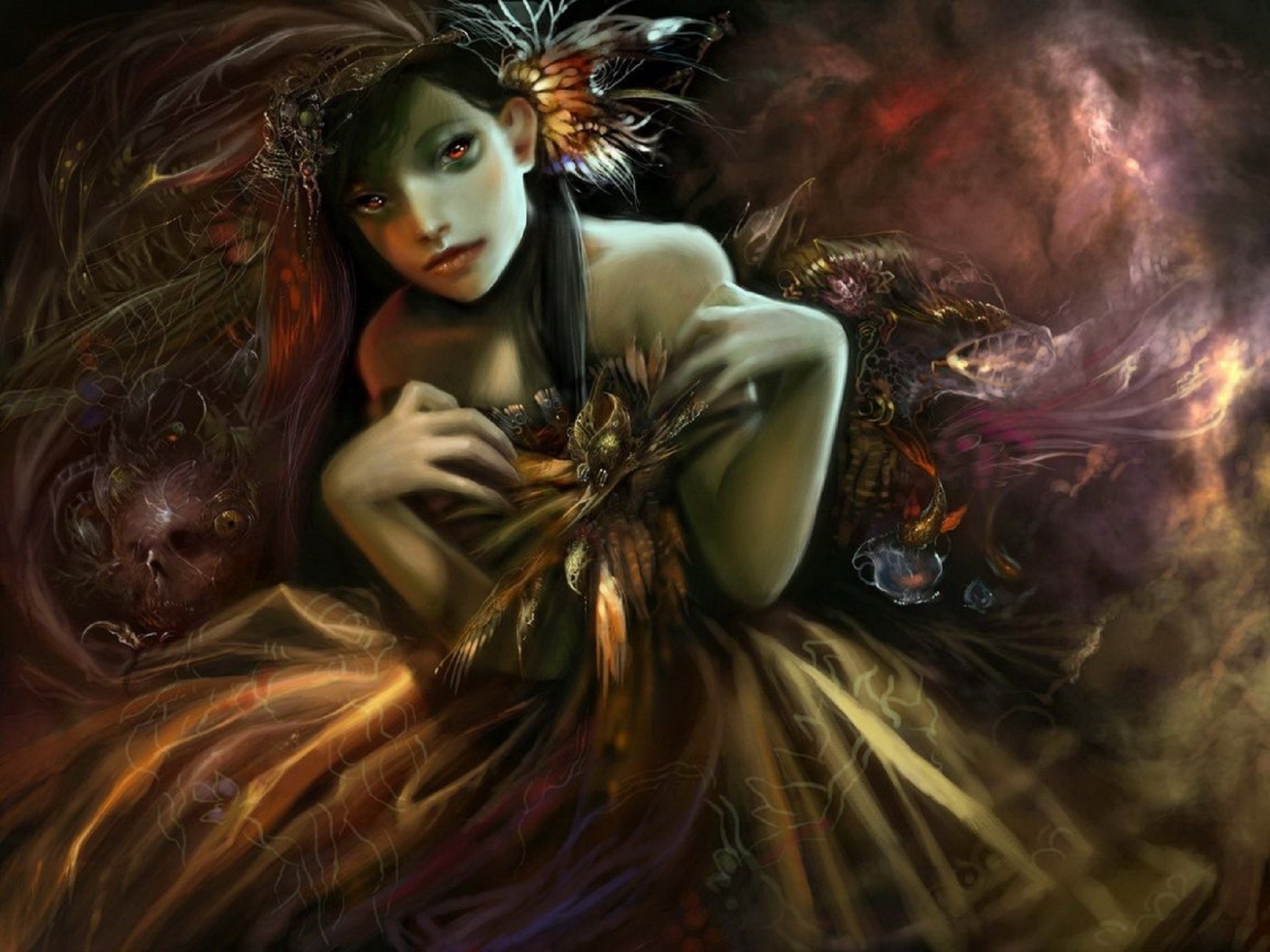 Schönes Mädchen mit blauer Haut und weißen Haaren, magisches Mädchen mit schrecklichem Wald, Mädchen Hexe im schrecklichen Wald, hässliche magische Frau mit Kristall