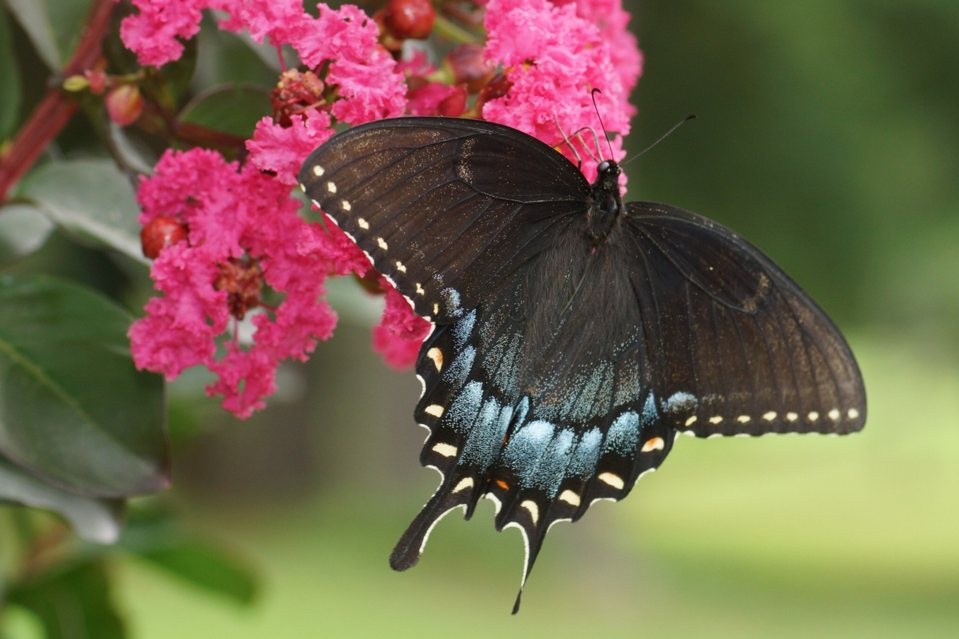 Ein Schmetterling mit schwarzen Flügeln sitzt auf einer rosa Blume