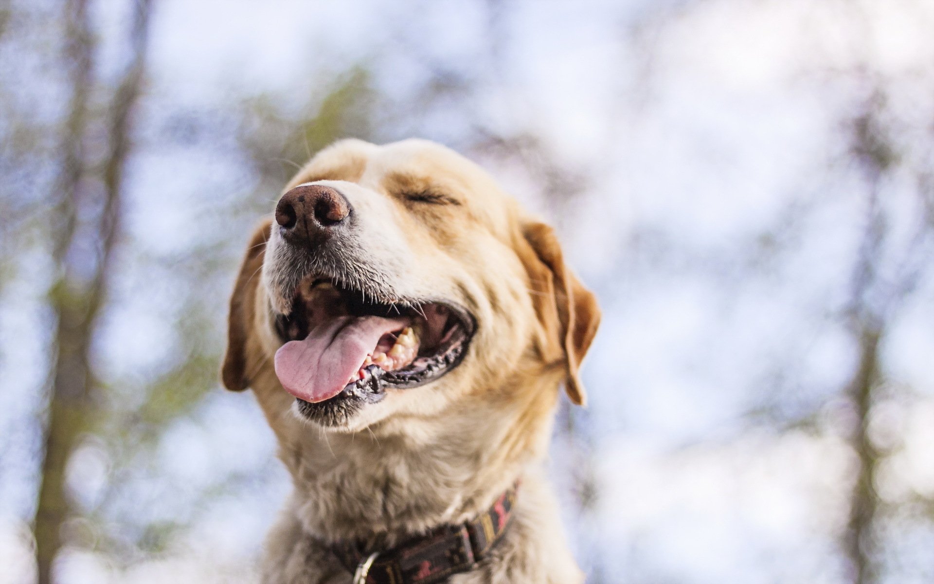 Die Schnauze eines zufriedenen Hundes auf einem verschwommenen Hintergrund