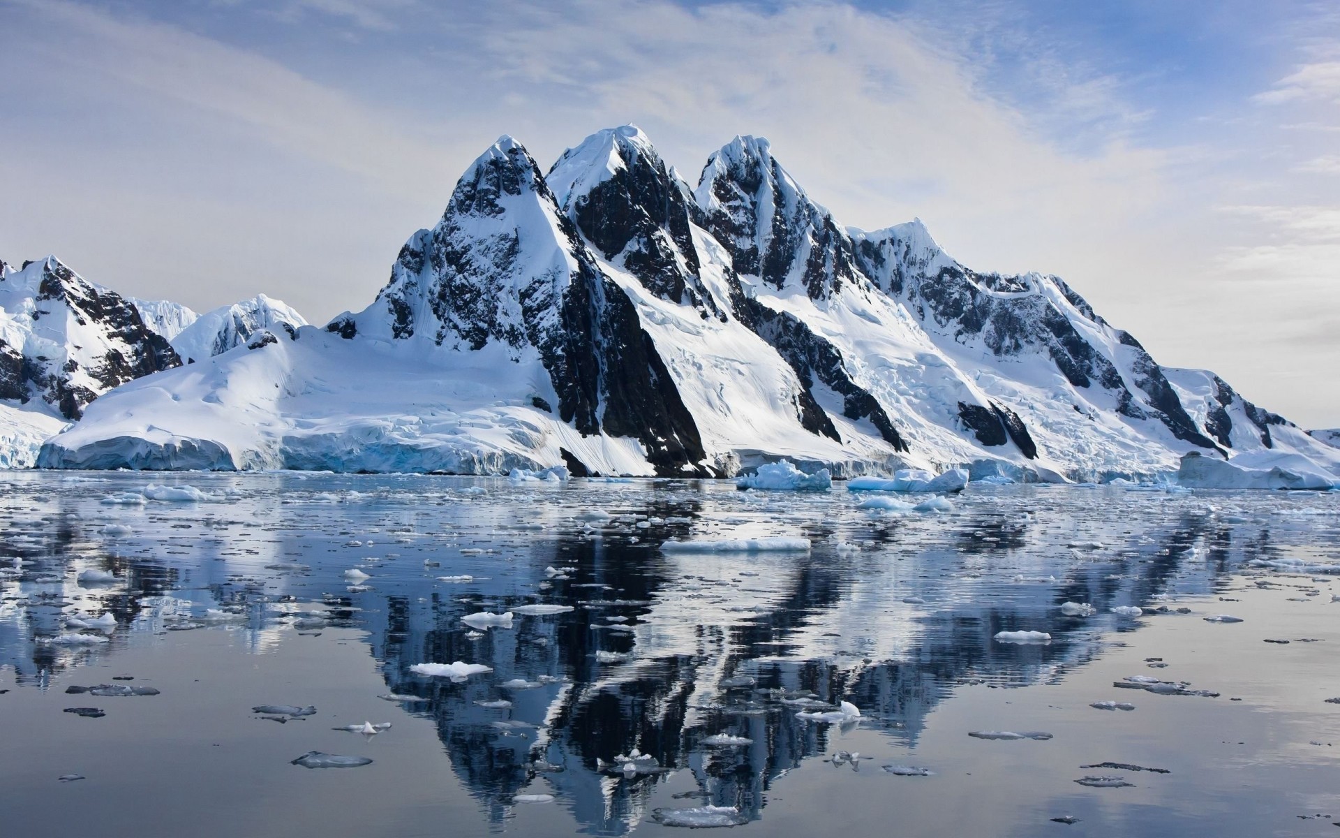 Schneebedeckte Berge Eisschollen Sonnenuntergang Bleiwolken
