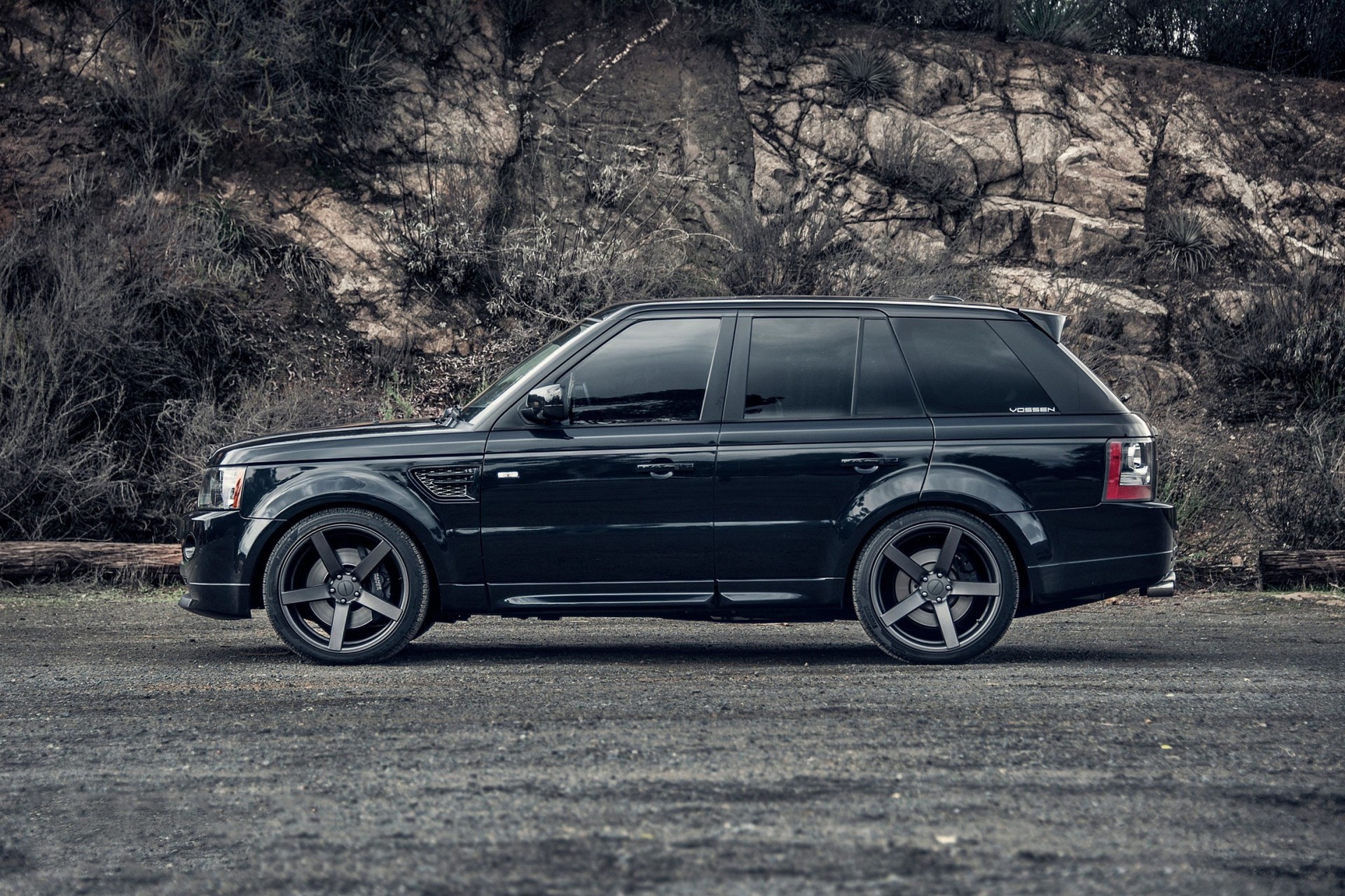 Schwarzes Auto steht vor einem Hintergrund eines Gebüsches