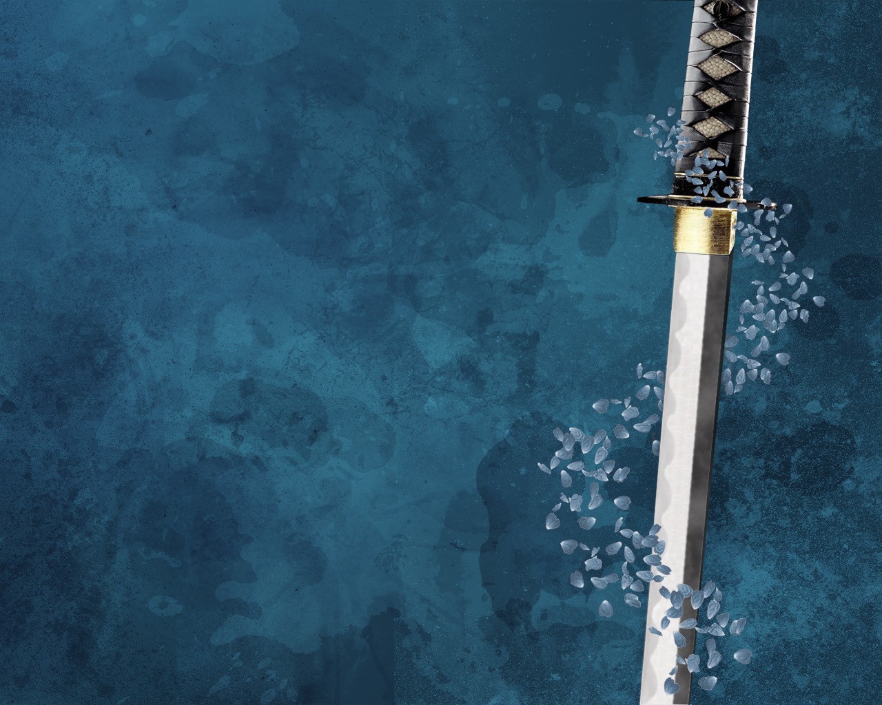 Schwert mit umwickelten Blütenblättern auf blauem Hintergrund