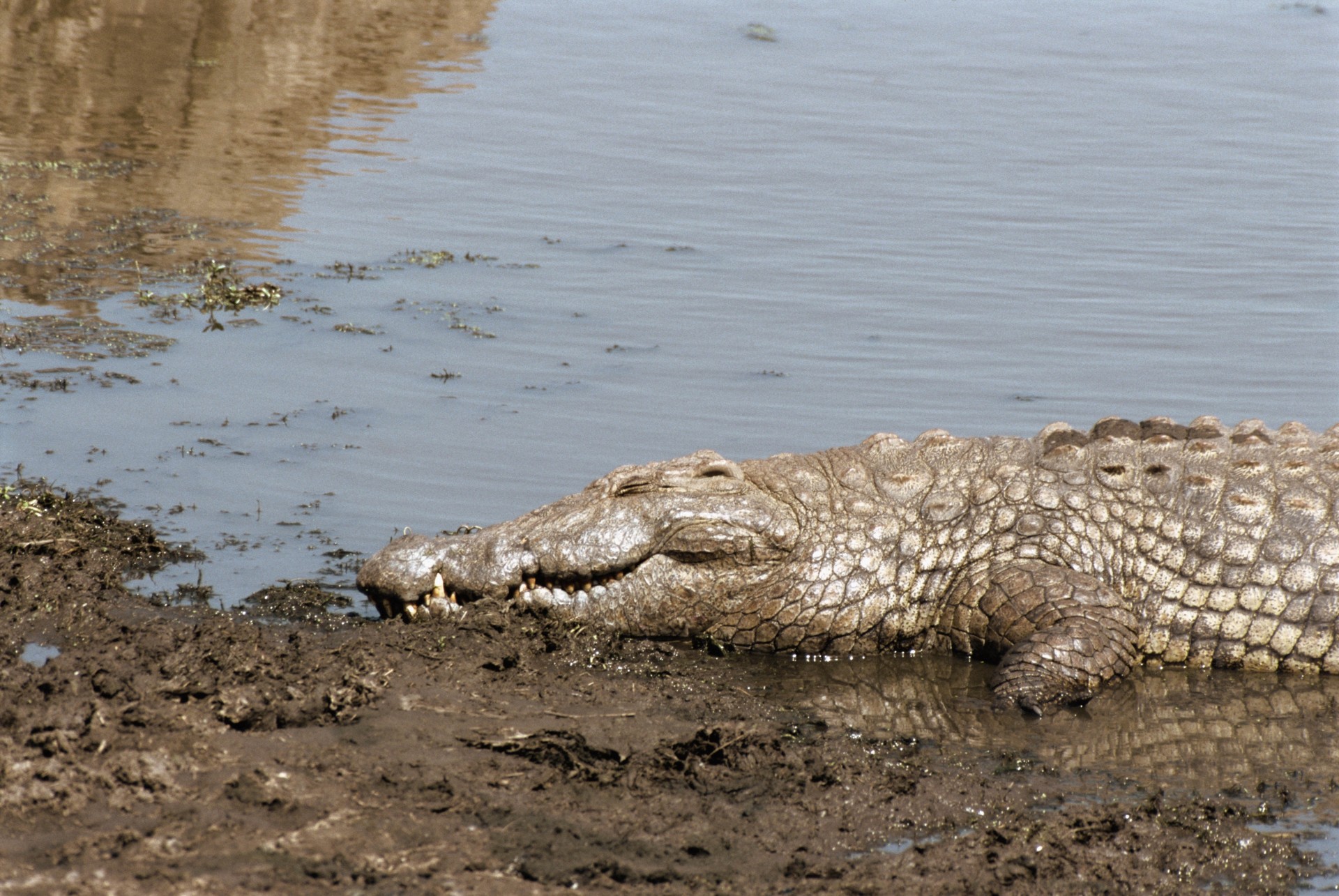 Storch fliegt über den See vor dem Hintergrund des blauen Himmels
