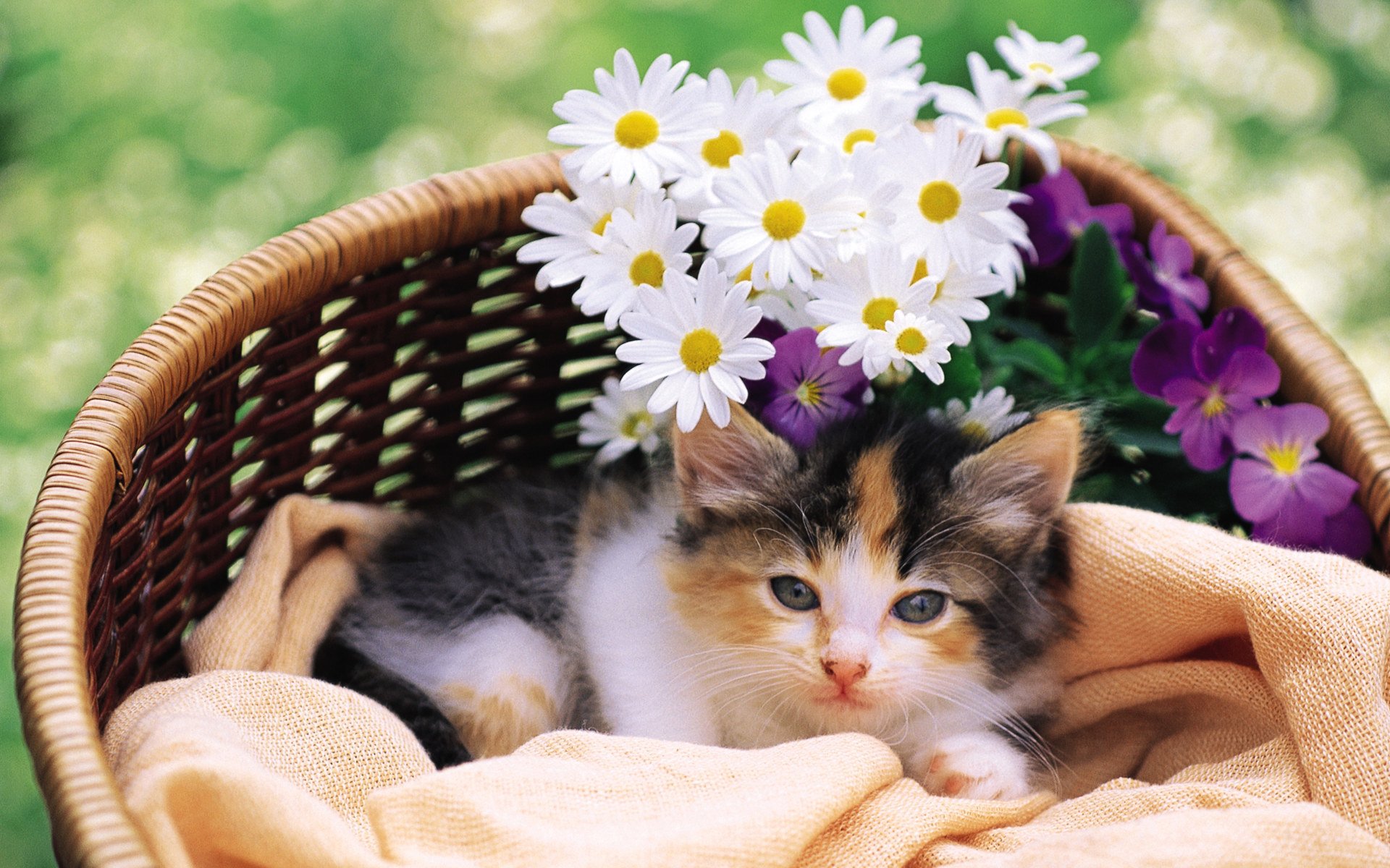 Kätzchen und Blumen im Korb