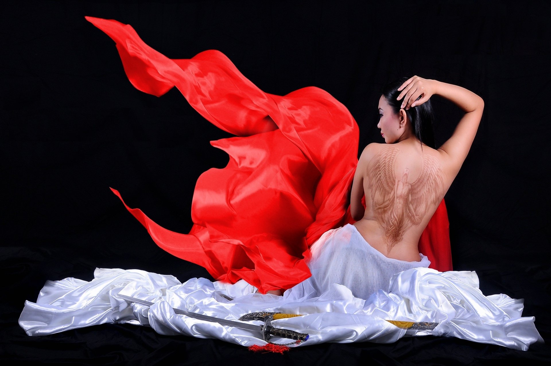 Asiatische Frau mit Flügeltätowierung auf schwarzem Hintergrund