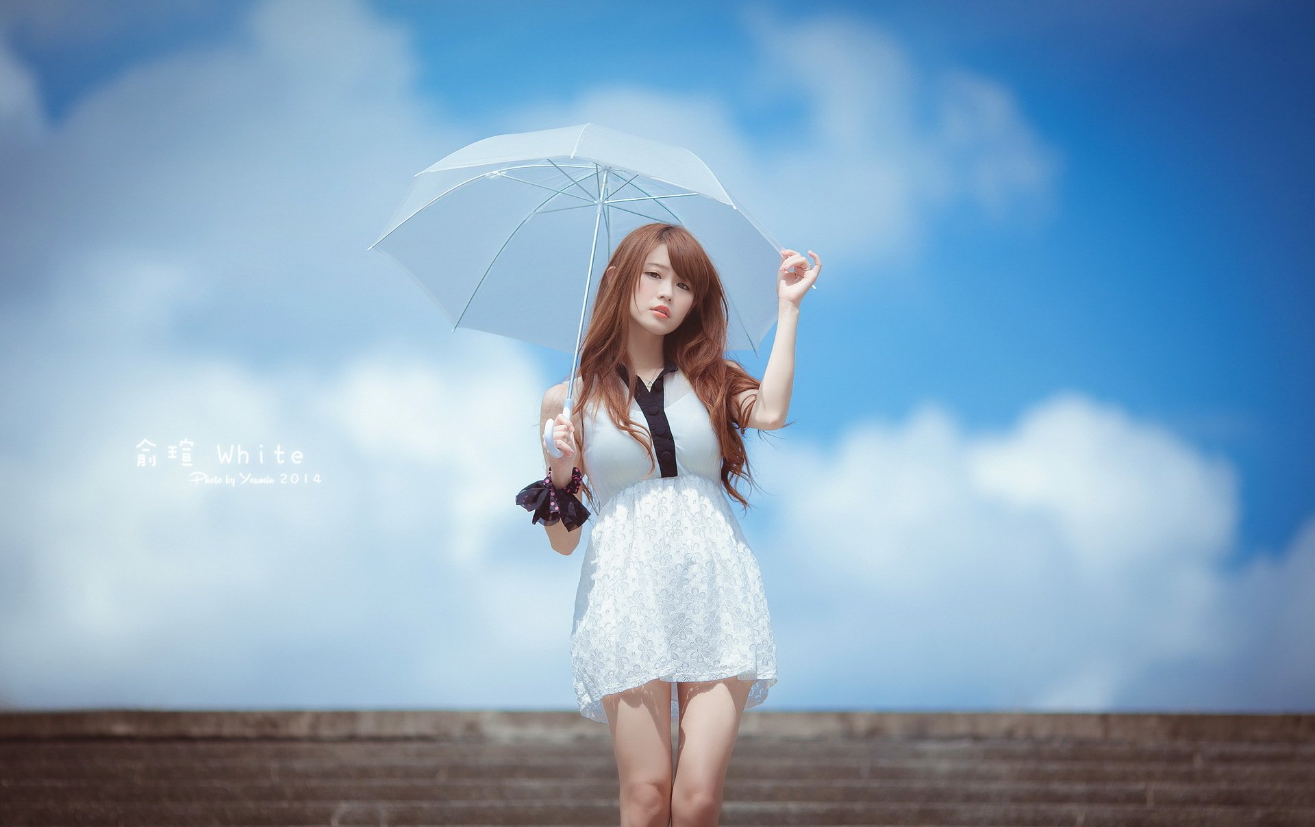 Asiatische Mädchen in einem stilvollen Outfit mit einem Regenschirm