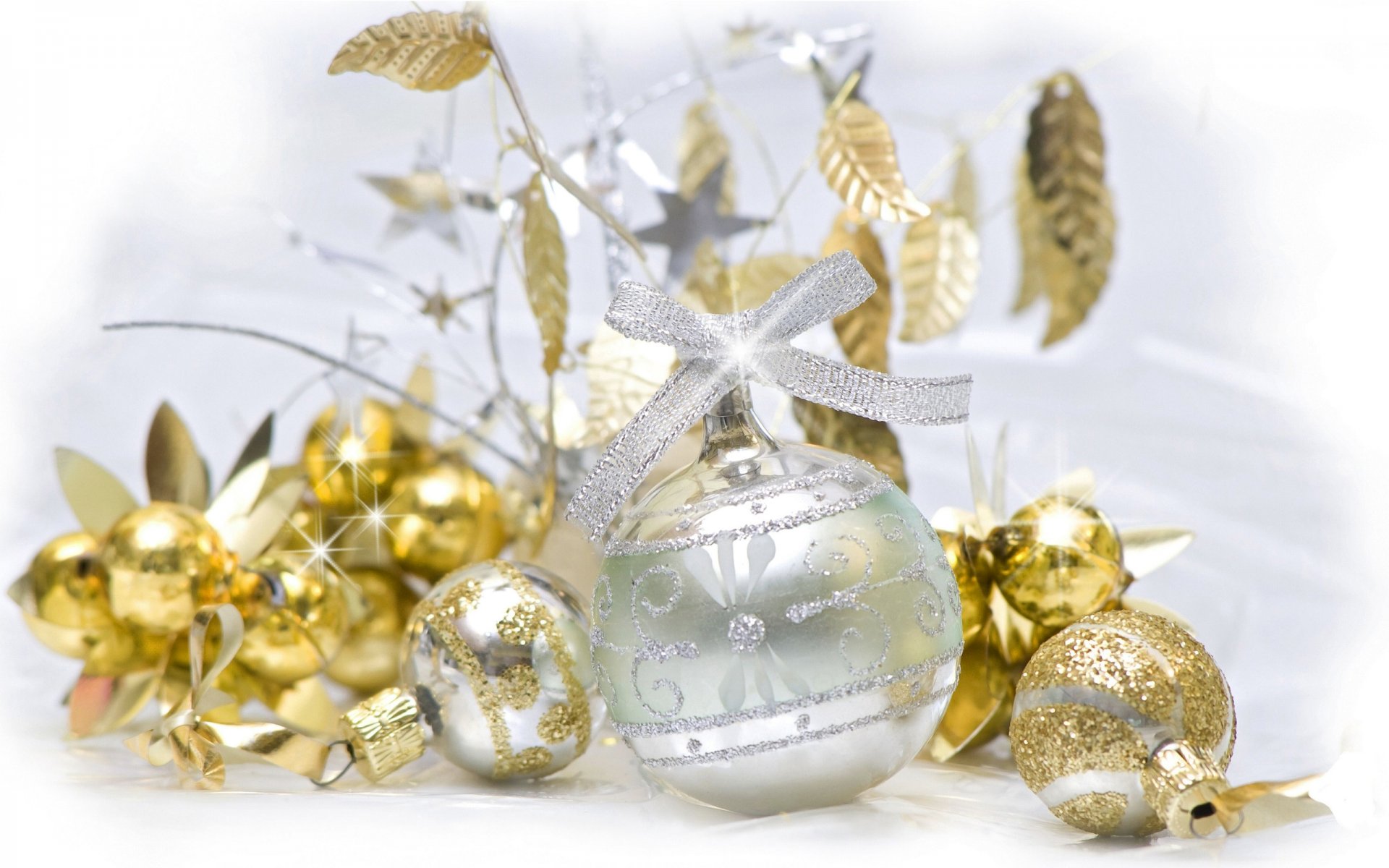 Silberner Weihnachtskugel mit Schleife auf goldenem Schmuckhintergrund
