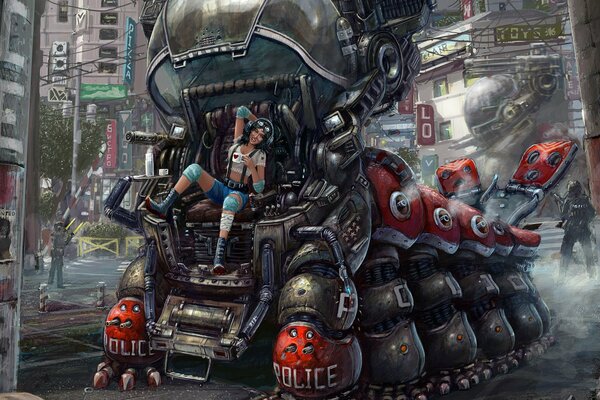 Art Fantasy Station der Zukunft - die Leute schauen auf das Flugzeug und ein Mädchen mit einem Bären in der Hand sitzt auf einem Koffer