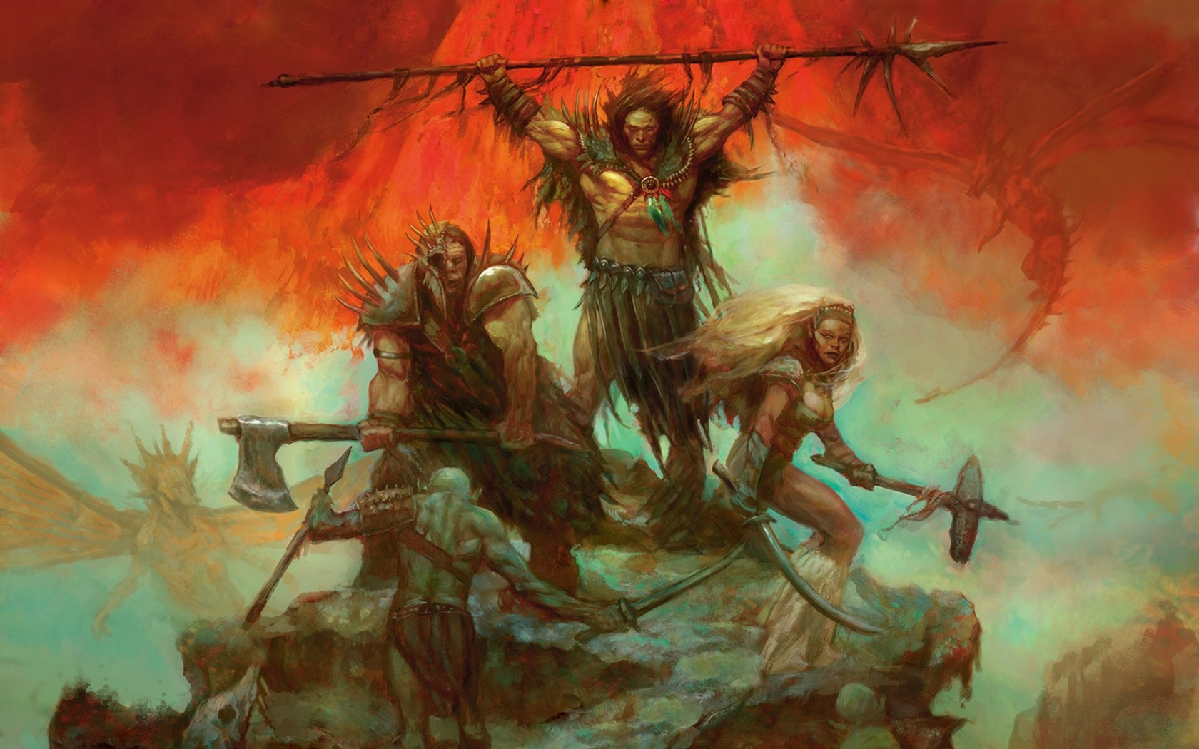 Krieger-Magier mit Schwertern und brennenden Augen in Rüstung