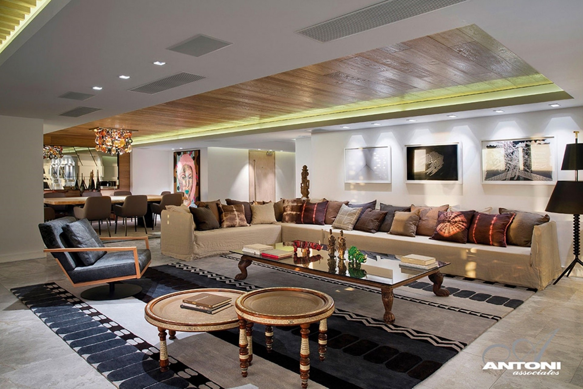 Wohnzimmer mit großem Kamin und Sofa in der Villa im Garten