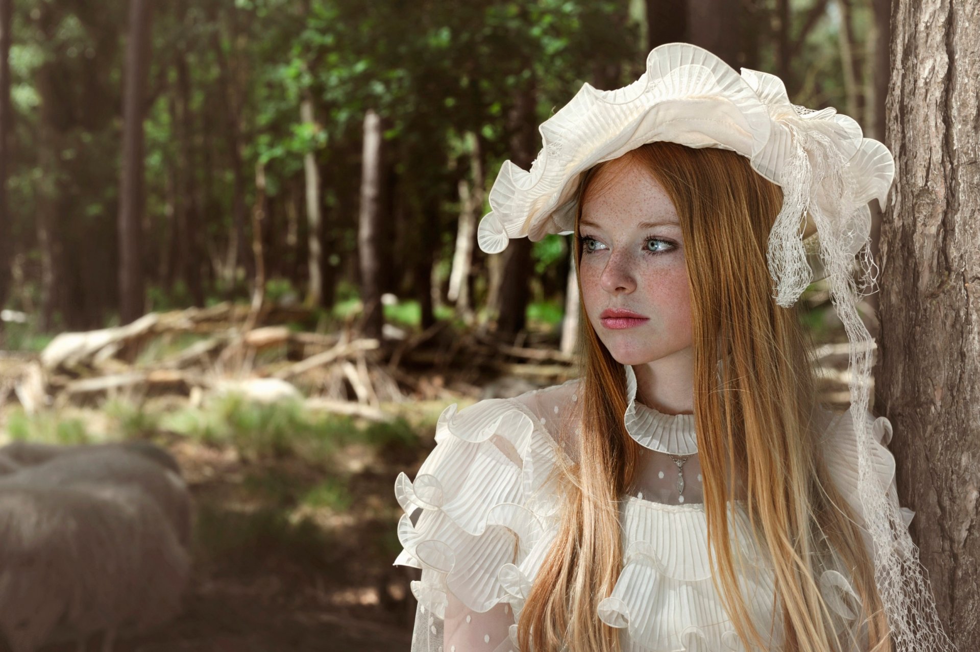 Die Blondine trägt einen Hut. Wald. Sommer