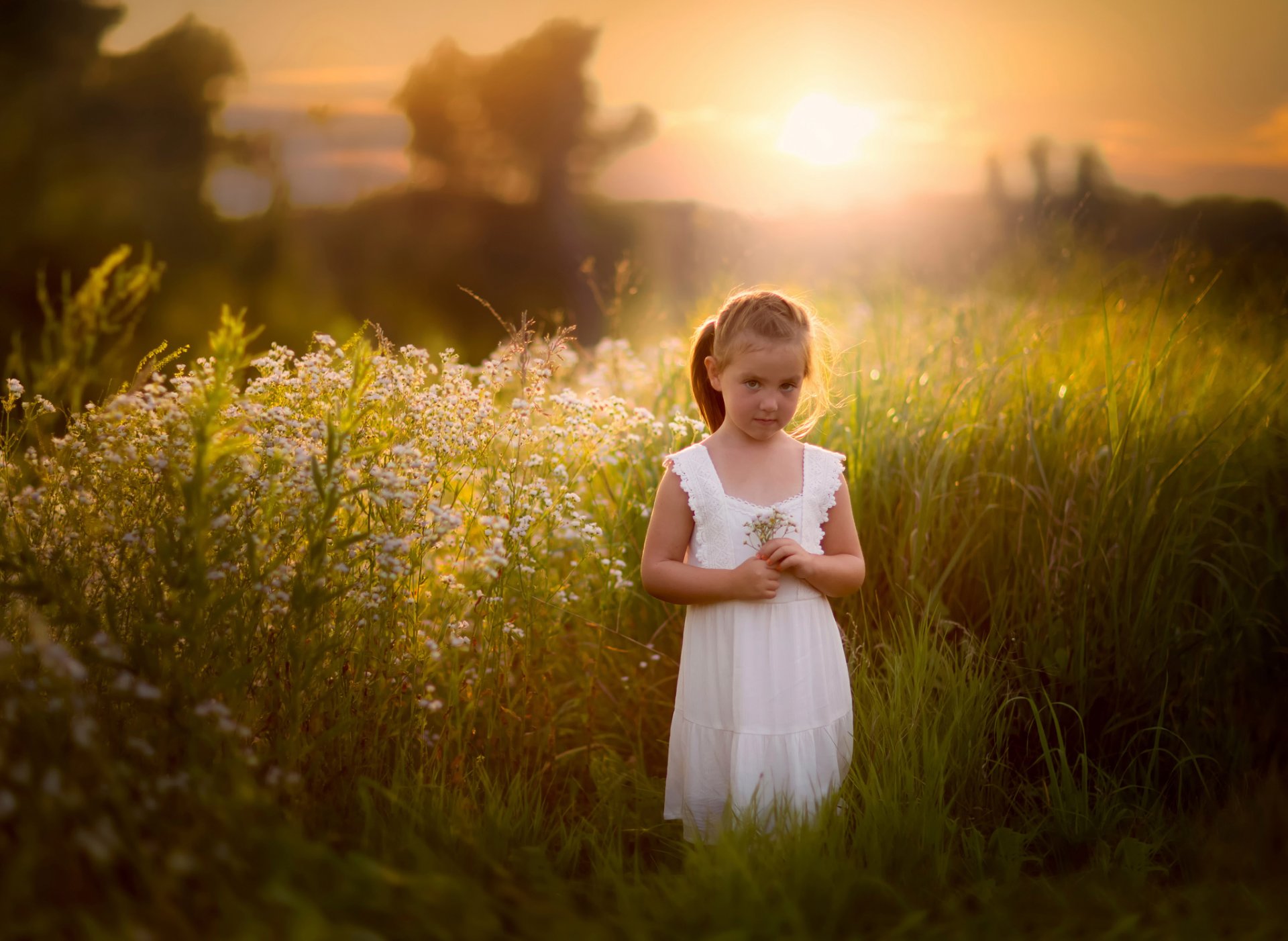 Kleines Mädchen in einem weißen Kleid im Sommer im Feld