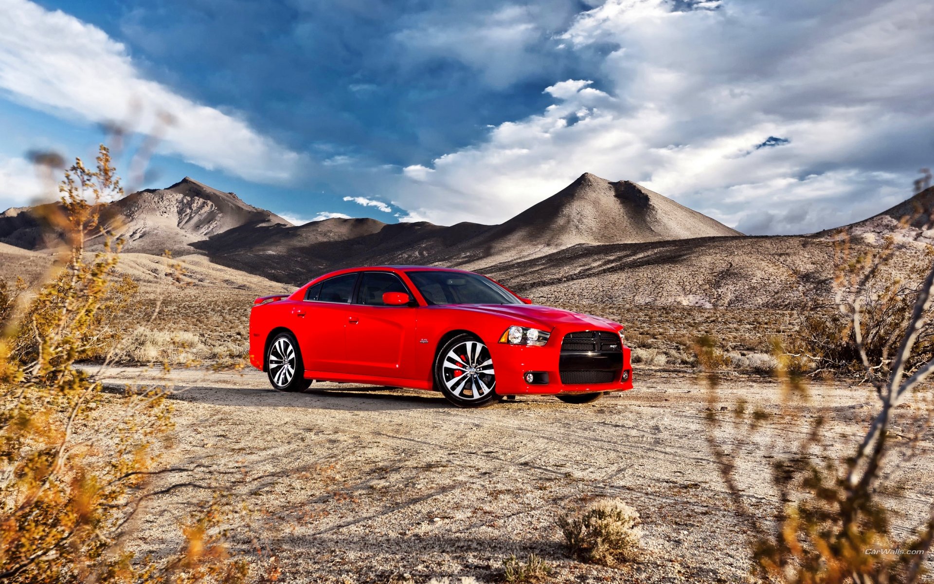 Rote Limousine vor dem Hintergrund der Berge und des Himmels