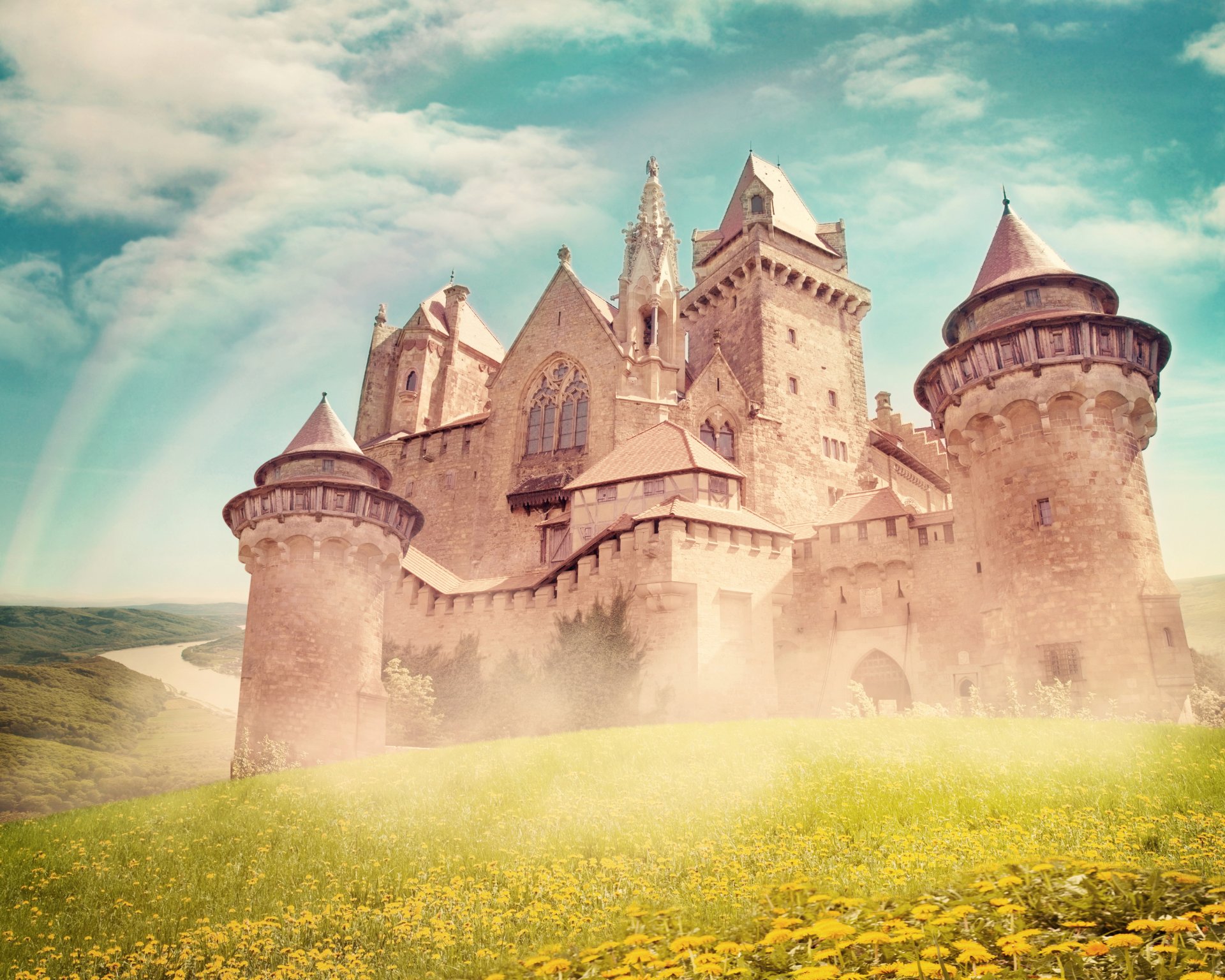 Sonnenstrahlen auf der Wiese und Löwenzahnblumen