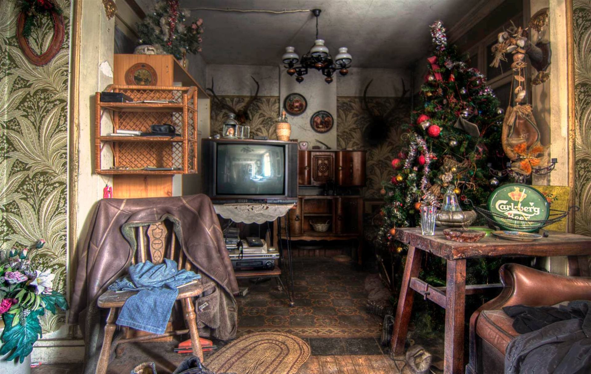 Silvesterlaterne in der Nähe des geschmückten Weihnachtsbaums