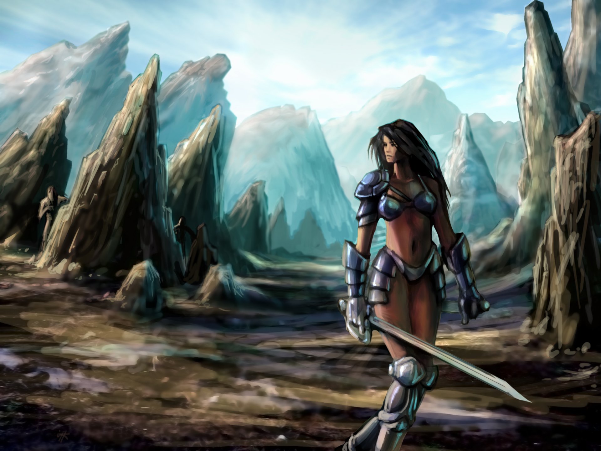 Mädchen in Rüstung vor dem Hintergrund der Felsen