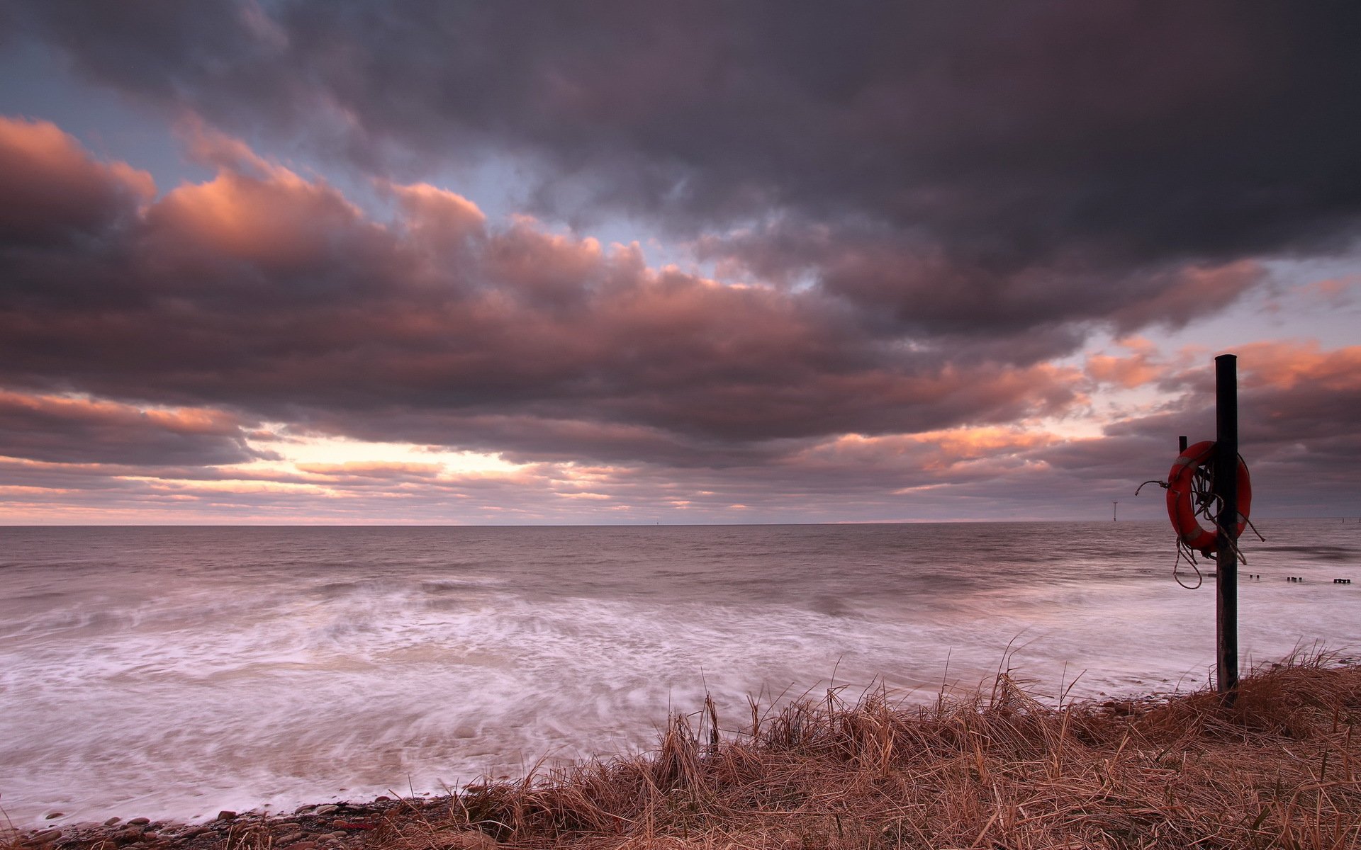 Strand am Meer bei Sonnenuntergang mit einer Säule und einem Rettungsring