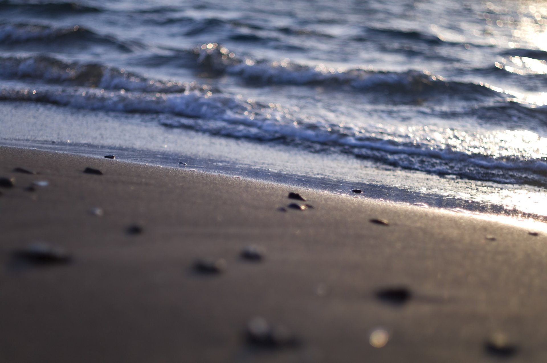 Katze auf Steinen am Meer bei Sonnenuntergang