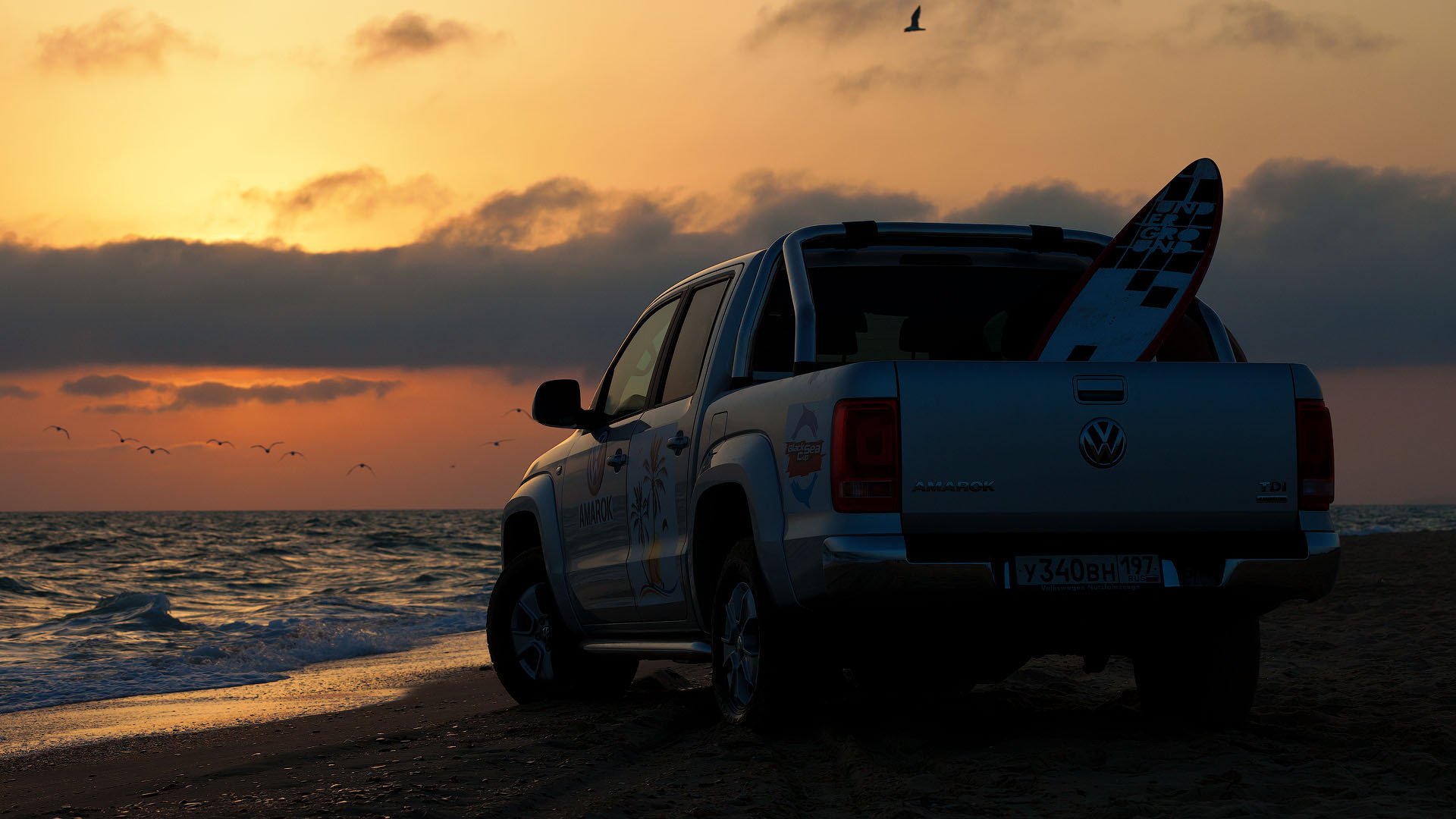 Pickup am Strand ea Sonnenuntergang Hintergrund