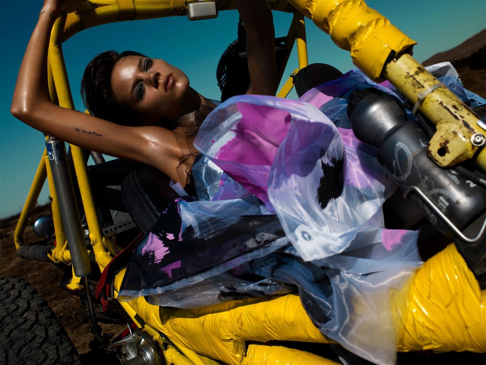 Ein Mädchen mit einer Pistole in einem langen, rassigen Kleid