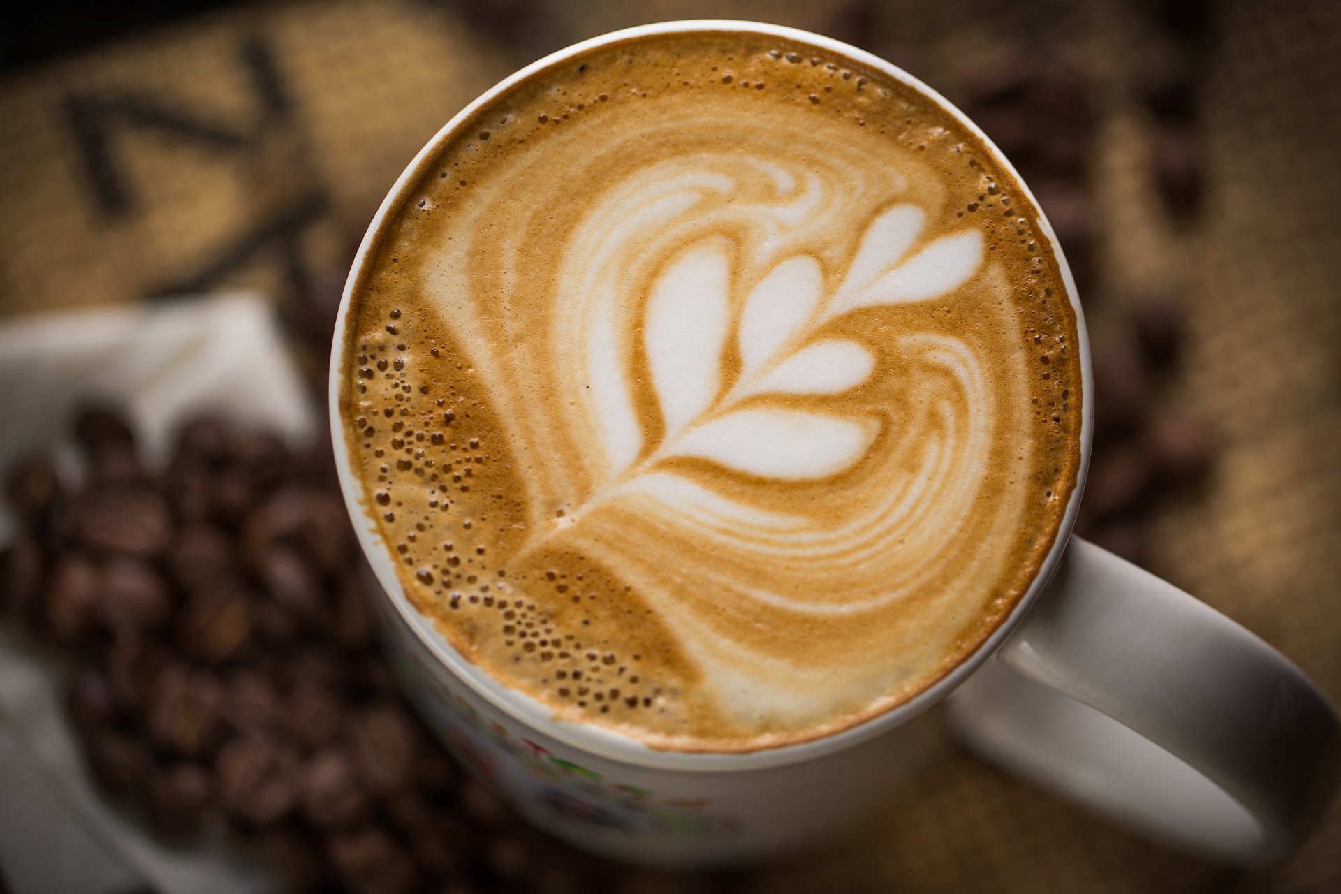 Streuen Sie Kaffeebohnen an einer Cappuccino-Tasse