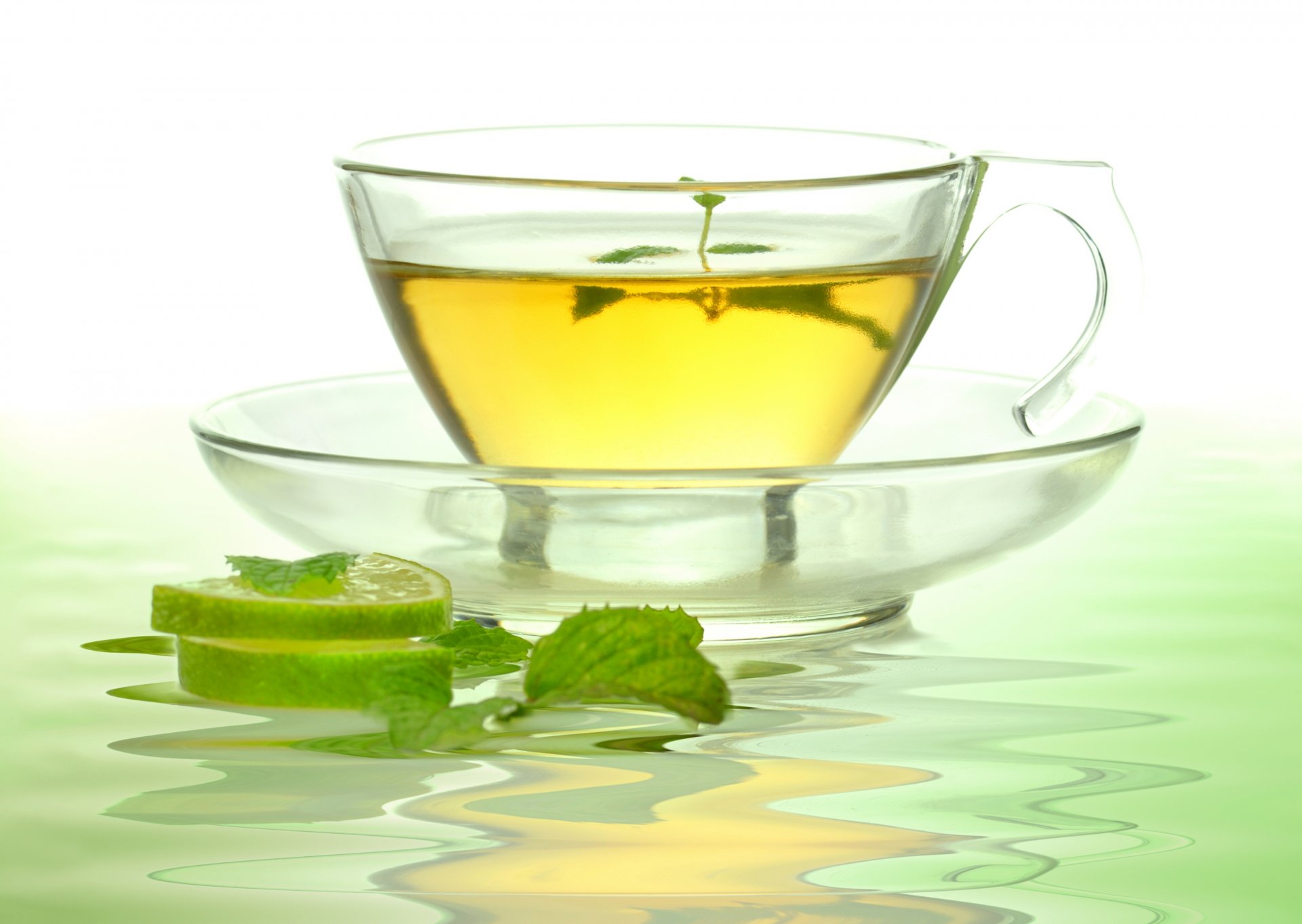 Tee mit Minze und Zitrone in einer transparenten Tasse
