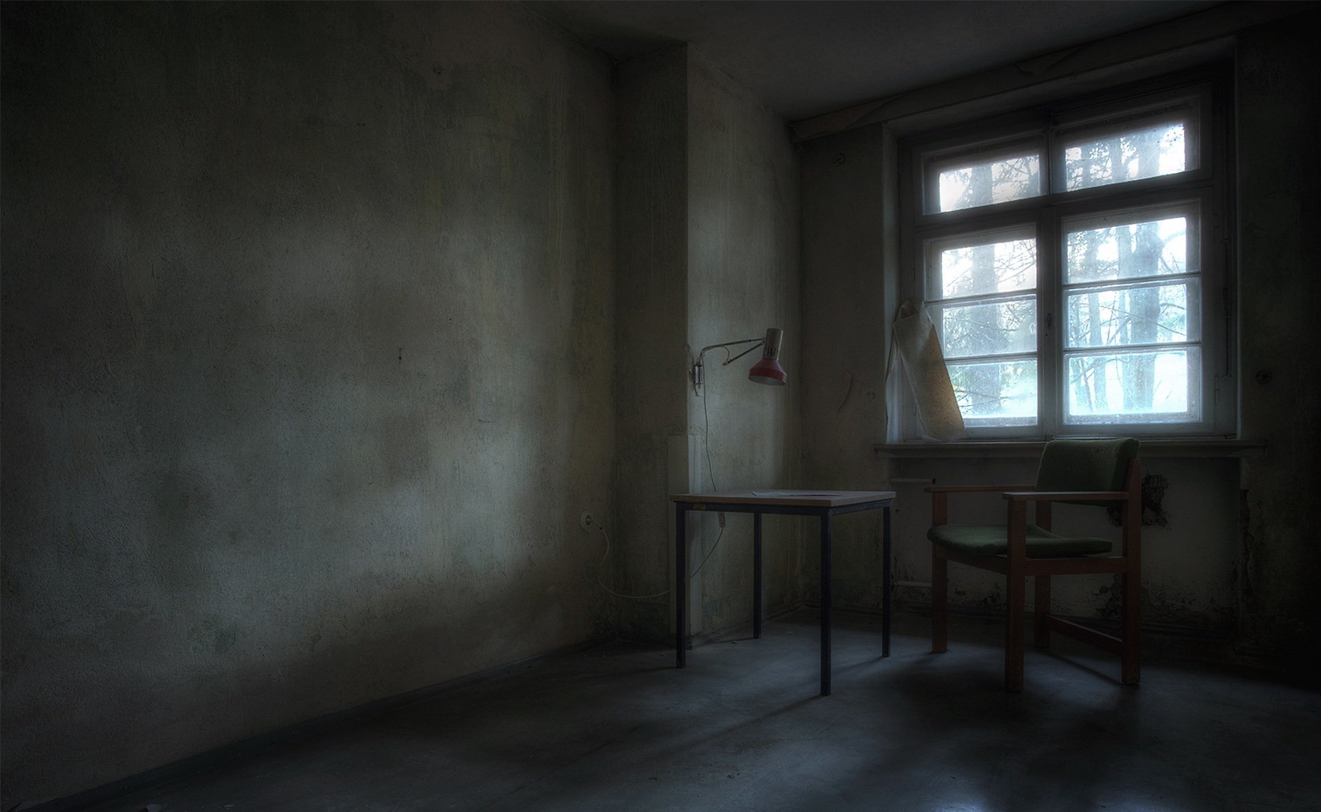 Ein Zimmer mit nackten Wänden und einem Tisch am Fenster