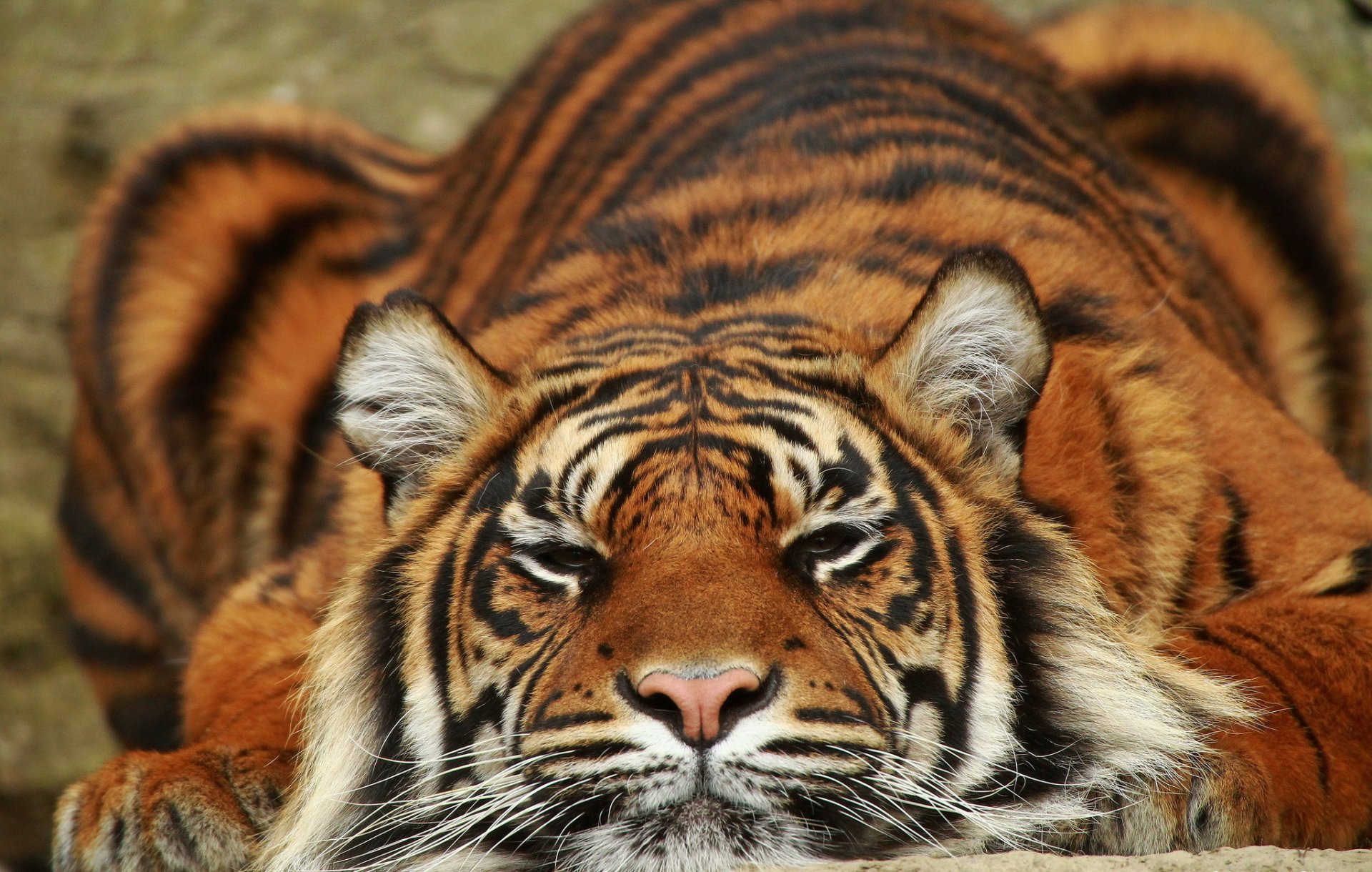 Der Tiger schläft ruhig unter den Sonnenstrahlen