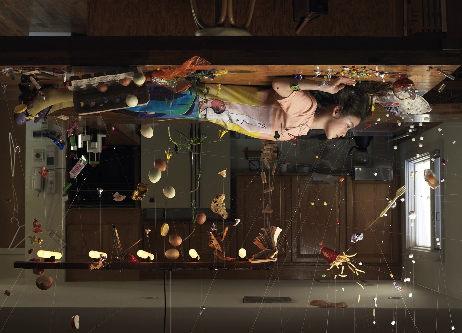 Holztisch, auf dem der Tisch eine Kamera und Turnschuhe ist