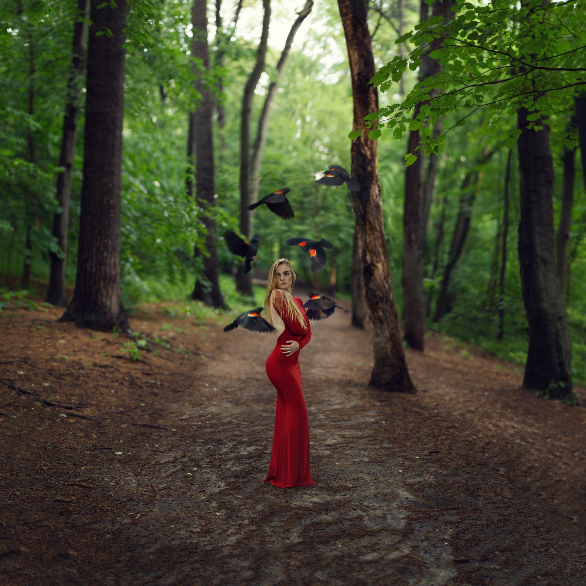 Ein Mädchen in einem schönen Kleid steht inmitten eines Waldes, umgeben von Vögeln