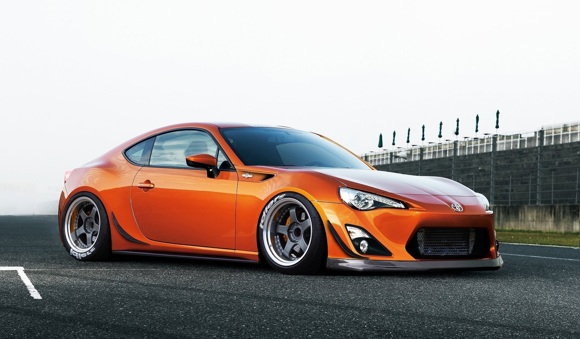 Toyota blaue Fließheck-Maschine auf dem Hintergrund eines Wasserfalls