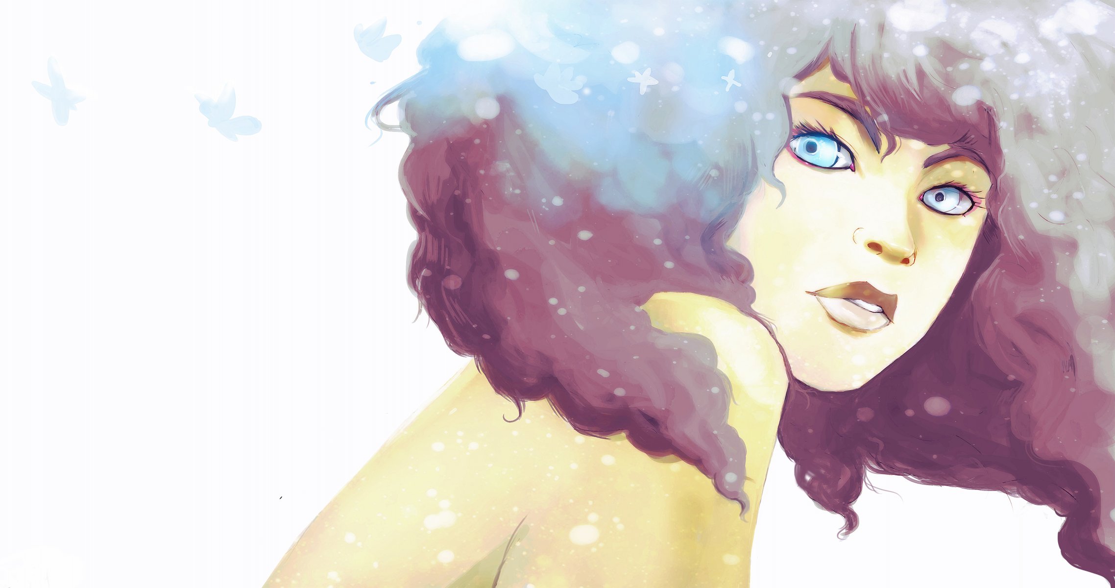 Das Gesicht eines Mädchens mit blauen Augen und welligem Haar